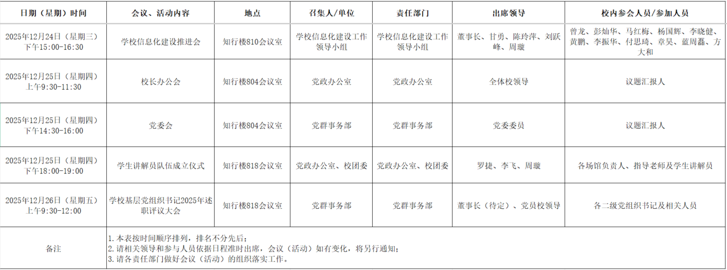 2025年秋季学期第十七周全校性会议活动安排表