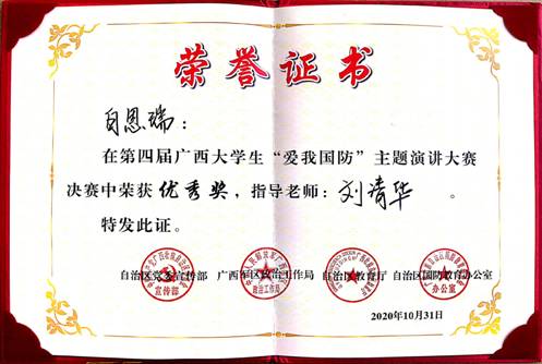 10月31日上午,由自治区党委宣传部、广西军区政治工作局、自治区教育厅、自治区国防教育办公室联合举办的广西大学生第四届“爱我国防”主题演讲大赛决赛在广西艺术学院举行。我院由武装部刘清华老师指导的外贸外语系白恩瑞同学的作品《携笔从戎终不悔,筑梦国防赤子心》从全区各大高校作品中脱颖而出,成功入围全区总决赛。