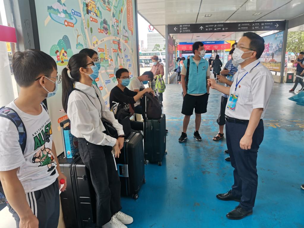当天上午,院长段复建、党委书记甘勇分别带队到学院大门、校内下车通道、5号公寓隔离区以及火车北站、火车站和机场了解相关工作开展情况,看望慰问返校学生和一线工作人员。段院长走访校内执勤点时表示,防疫一线工作非常辛苦,要求也十分严谨,大家要本着对学院和学生负责的态度认真落实每一个环节,以热情、贴心的服务迎接每一位返校学生。甘书记在车站、机场逐一慰问每位教职工,对他们这2天的辛勤付出表示感谢,对疫情发生以来学院全体教职员工所体现出来的责任与担当给予高度肯定。在亲切问候在场等候的学生时,甘书记叮嘱每一位返校学生要做好个人防护,务必在老师的引导下安全有序返校。