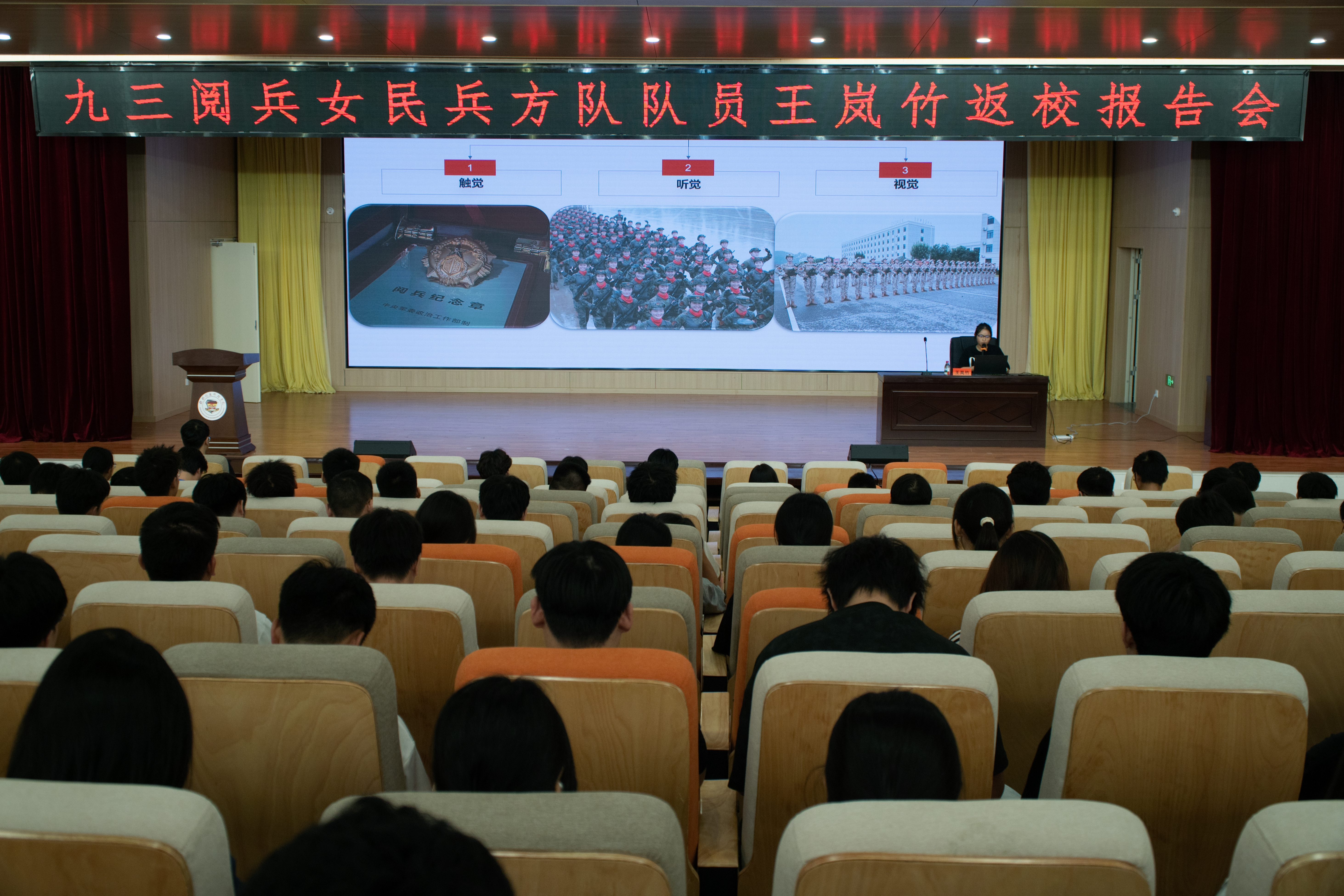 10月13日,beat365官网在博文楼F107报告厅举办九三阅兵女民兵方队队员王岚竹返校报告会。本次报告会由参与阅兵的王岚竹担任主讲人,全校300余名师生现场聆听,共同感受中国女民兵的热血担当与精神力量,接受了一场深刻的爱国主义教育与理想信念洗礼。