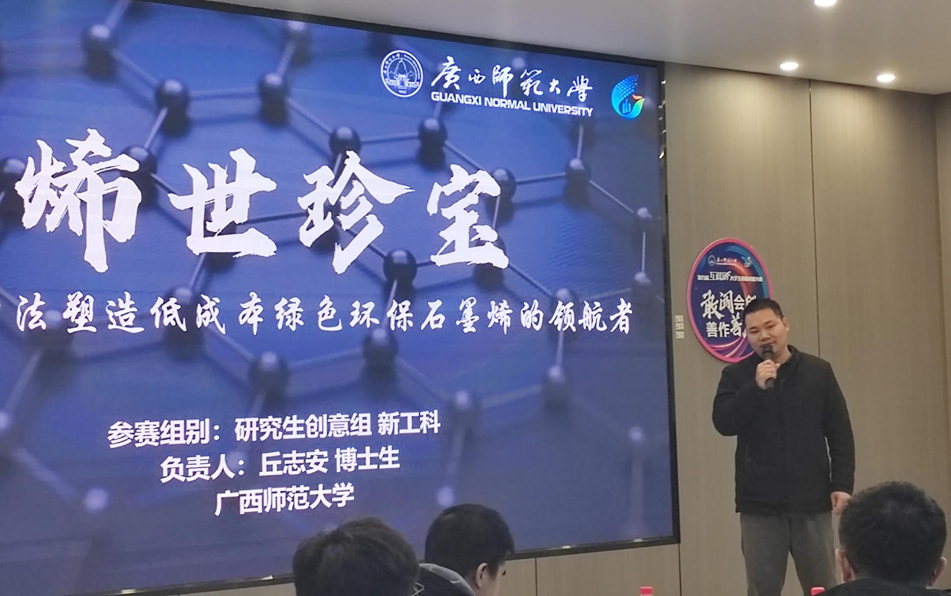 第三讲是由广西师范大学丘志安博士分享他在创新创业项目《烯世珍宝——低成本绿色环保石墨烯的领航者》中的经验心得。丘志安博士围绕项目的核心技术和产品优势,讲述团队在项目实施阶段所遇到的问题以及解决方法,通过深度讲述创新创业项目的孵化过程,为在场师生提供宝贵的经验和启发。