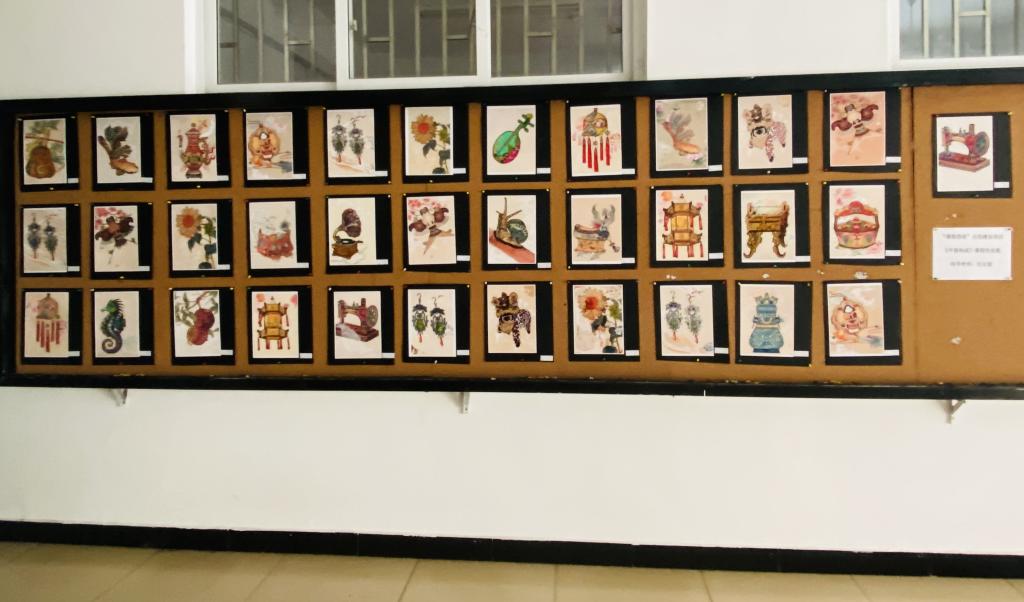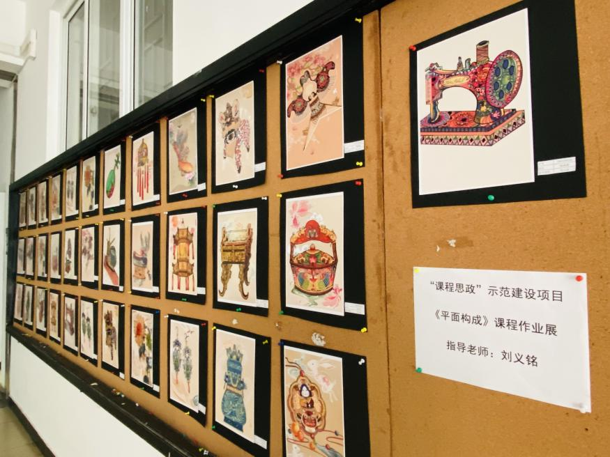 本次展览充分展现了同学们在《平面构成》课程中的学习情况,本门课程作为设计构成基础课程,是引导学生建立理性思维的方法,学习现代设计不可缺少的基础训练重点课程。任课教师刘义铭,在原有的设计基础构成课内容中融入课程思政理念,在传统的点、线、面构图的训练中加入中国传统纹样元素,在传统构成组织形式中融入中国优秀的传统文化和“匠人”精神,引导学生从课堂上探索和感知校园生活环境的美,通过思想上的引导来激发学生对课程的学习兴趣,培养他们审美的能力,让学生选择自己感兴趣的内容,独立观察和学习,探索创意元素和材料,最终围绕含有中国传统纹样元素的物品进行结课作品设计展示。