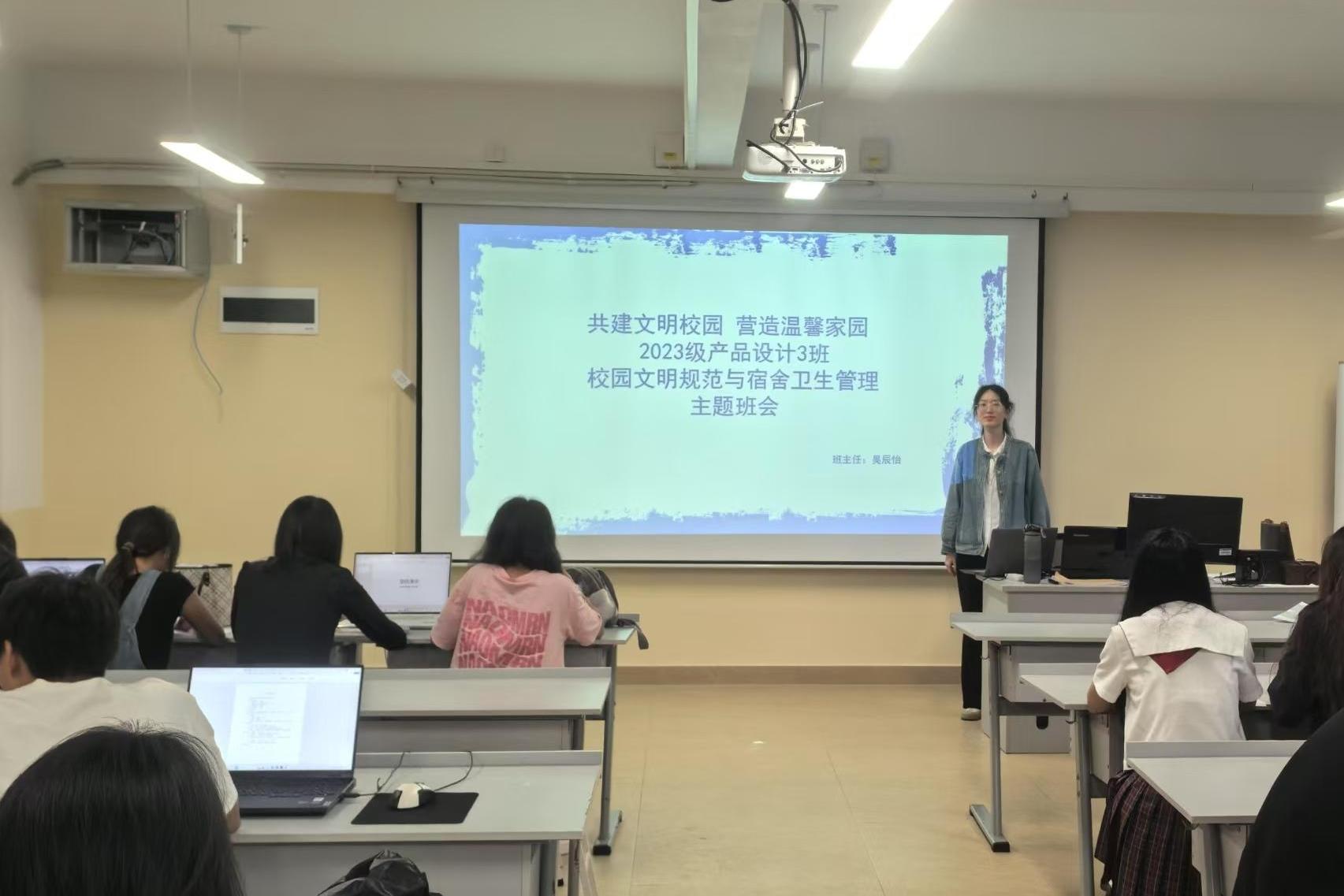 为深化校园文明建设,提升学生宿舍安全与卫生管理意识,2023级产品设计3班于5月29日在守正楼G206教室举行班会,聚焦近期宿舍用电安全与环境卫生规范。班会由班主任吴辰怡老师主持,旨在引导学生树立安全底线思维,携手营造整洁、和谐、安全的校园生活环境。