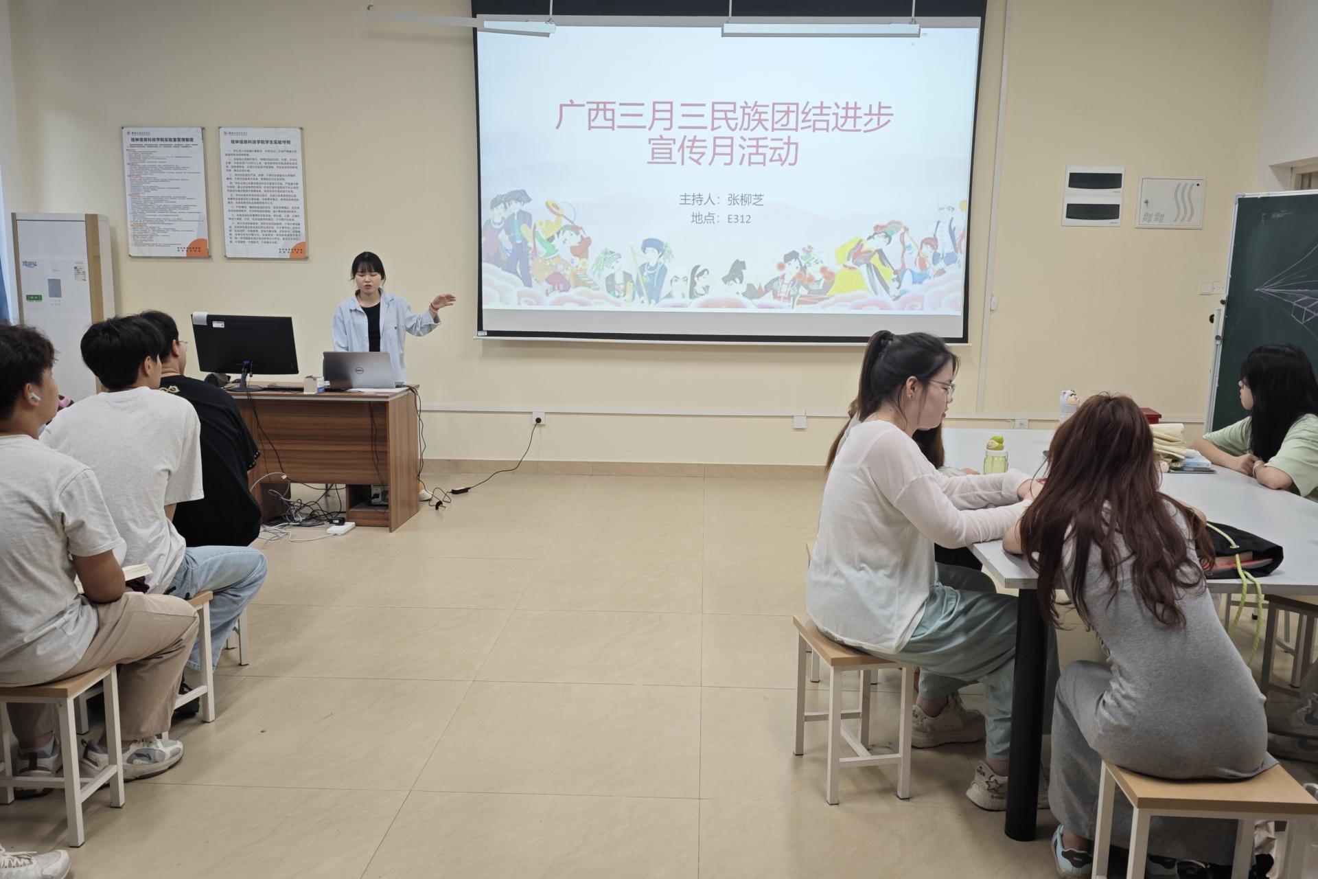 2025年4月22日,2024级产品设计2班的班主任张柳芝在德远楼E312,开展了以“铸牢中华民族共同体意识”为主题的班会活动。本次班会以广西“三月三”传统节日为载体,通过专题讲解、政策解读等形式,深入开展了民族团结进步教育。