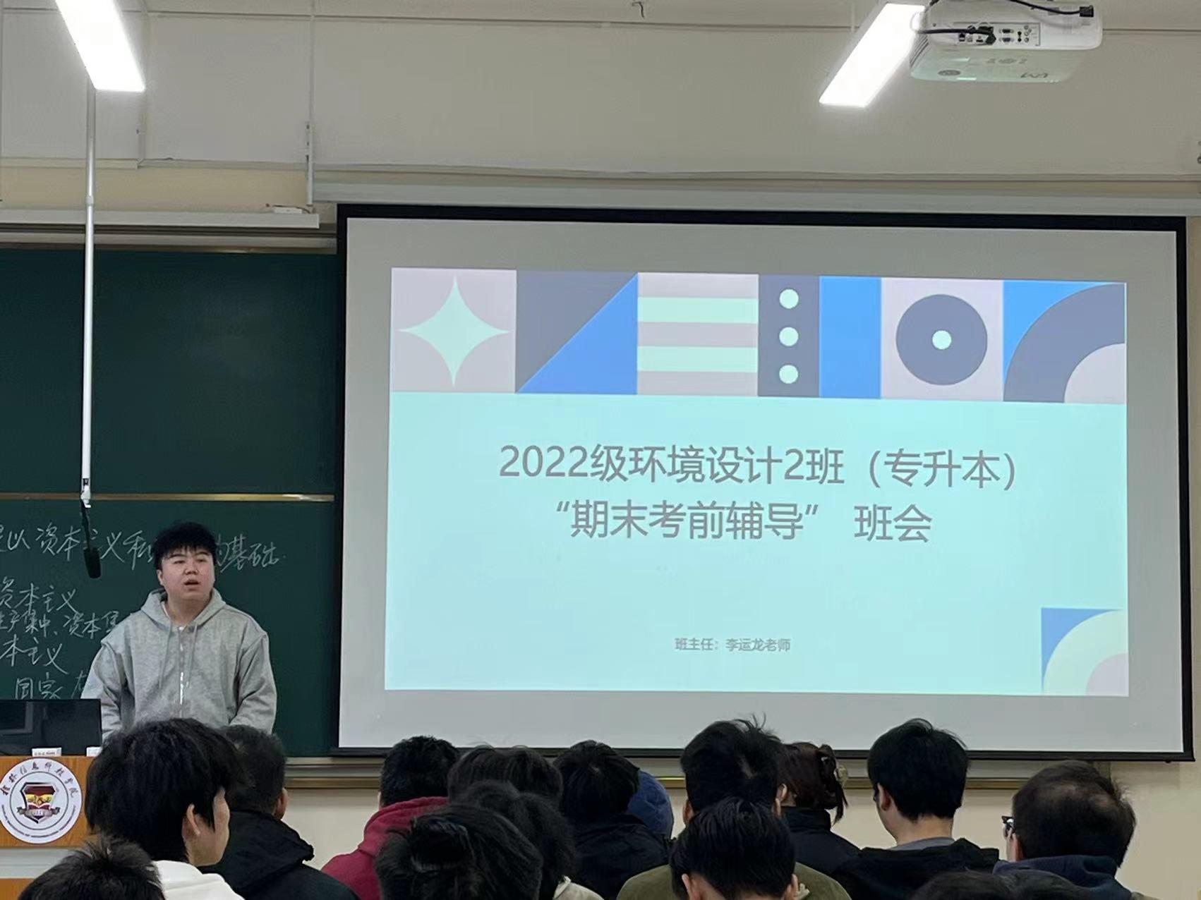 12月23日,创意设计学院22级环境设计专升本2班召开了一场以“期末考前辅导”为主题的班会。本次班会旨在帮助学生合理规划时间,提高复习效率,为即将到来的期末考试做好充分准备。