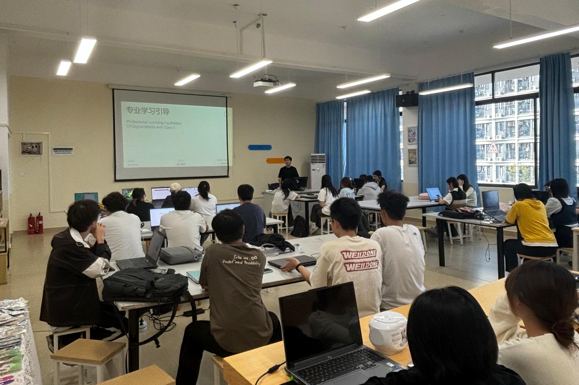 黄增扩老师首先对数字媒体艺术专业进行了深入介绍,如从专业的定义与特点,到其发展历程以及未来的发展趋势等方面,让同学们对自己所学专业有了更清晰的认知;并且详细讲解了课程设置、教学方法和考核方式,为同学们规划学习路径提供了有力依据。与此同时,也展示了业界内的专业优秀作品以及学姐、学长的学生成果,激发起同学们内心对专业学习的强烈渴望。