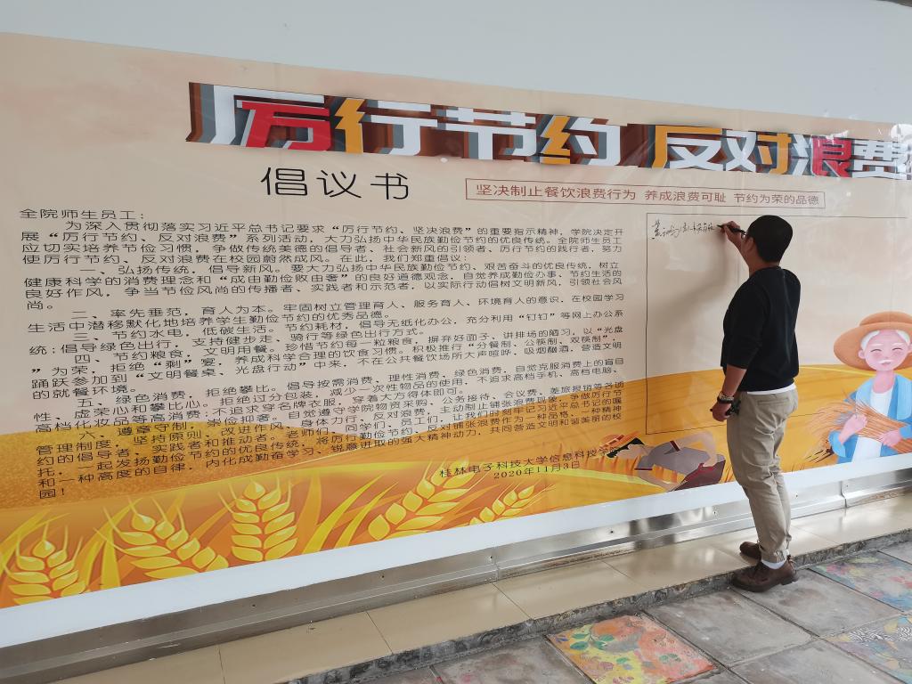 为了大力弘扬中华民族勤俭节约的优良传统,在广大师生中树立节约光荣、浪费可耻的思想观念,设计系于四教二楼平台开展“弘扬厉行节俭反对铺张浪费”倡议签名活动。