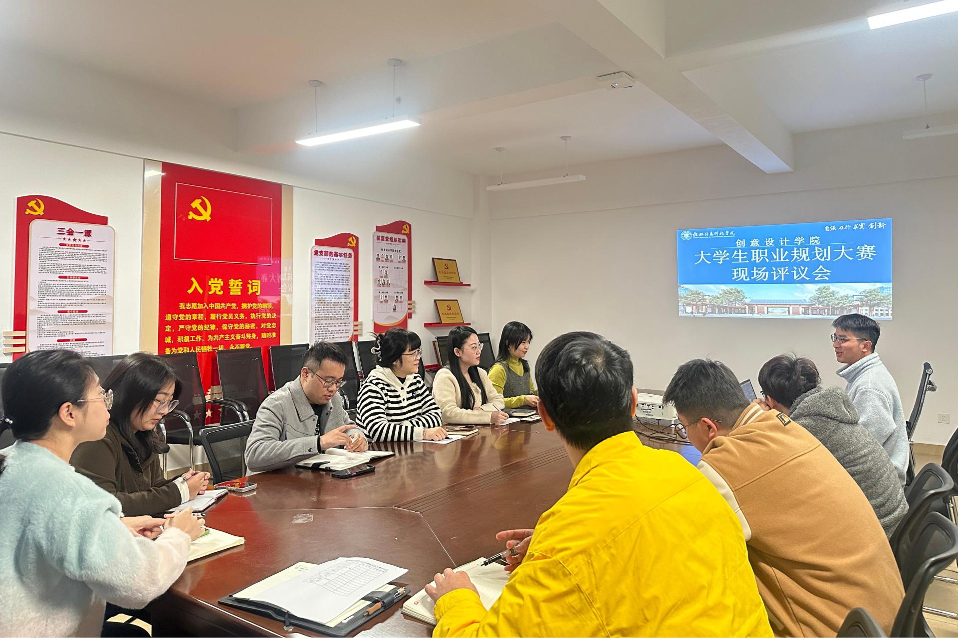 为推动学生职业规划教育,创意设计学院于11月20日召开了大学生职业规划大赛现场评议会。党总支副书记刘珊珊老师、学院就业指导老师及全体辅导员出席会议,会议由辅导员翟基辉老师主持。翟老师简要介绍了参赛作品和评议要求。此前,学院共收到943份报名材料,经过严格评审,50份优秀作品脱颖而出,进入学院复赛。本次大会对这50份作品进行评议与筛选,最终选出代表学院参加校赛复赛的优秀作品。刘珊珊书记在会上强调了大赛的意义...