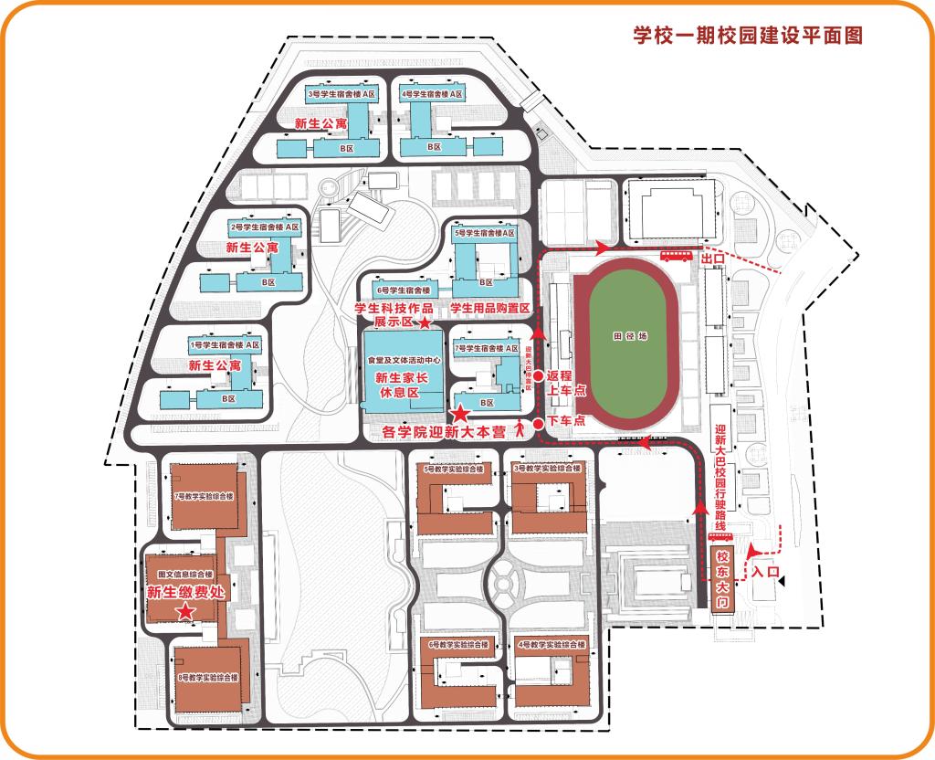 新生及家长乘坐大巴从学校东大门入校,从东侧门出校。大巴车进校后各学院迎新大本营点路段下车,在学校志愿者引导和帮助下,新生可到所在学院迎新大本营报到点注册报到。返程的家长可在体育教学楼副楼和7号学生公寓(崇礼楼)之间路段上车,如下图所示。