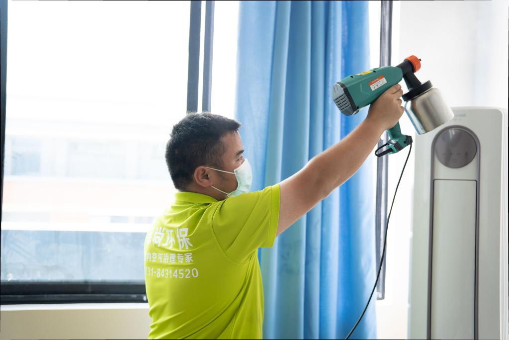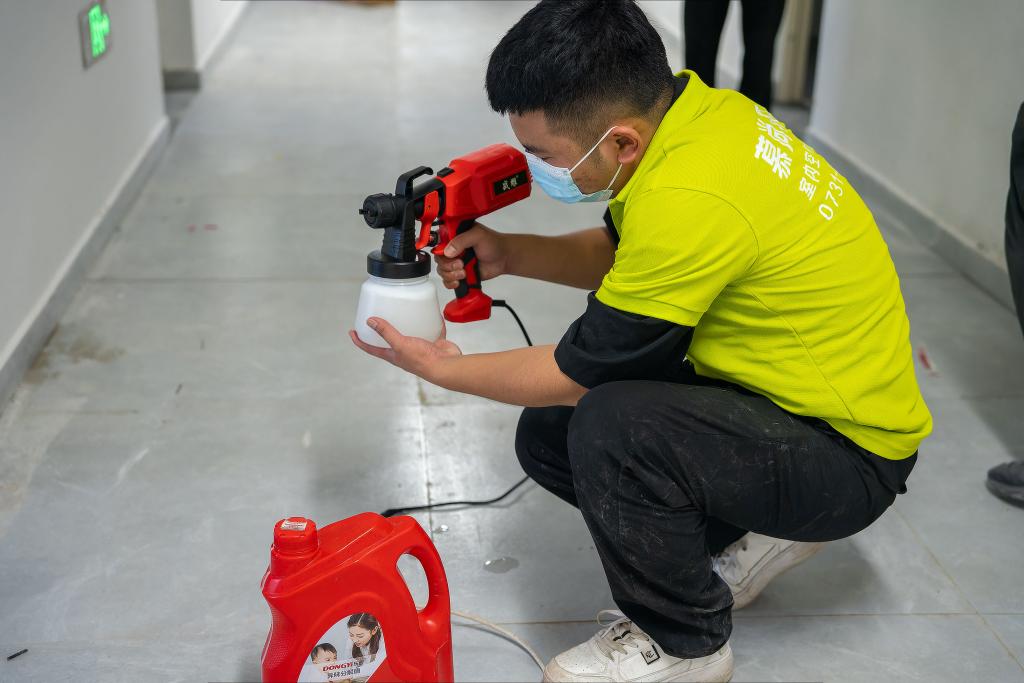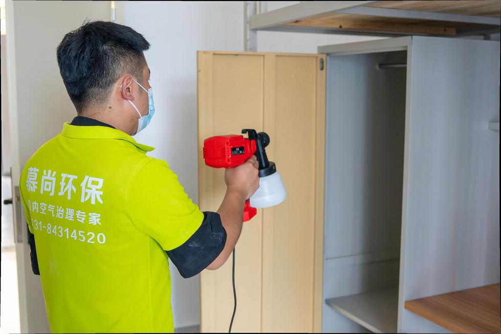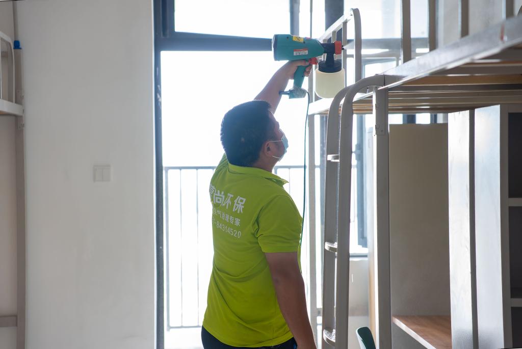 近日,学校请专业团队使用甲醛清除剂,对办公室、公寓、教室、图书馆等所有的柜子、桌椅、门窗进行全方位高压雾化喷涂,清除板材内存留甲醛,对于难以清理的地方,工作人员使用专业强力清除剂进行反复的喷涂处理,确保清除效果。