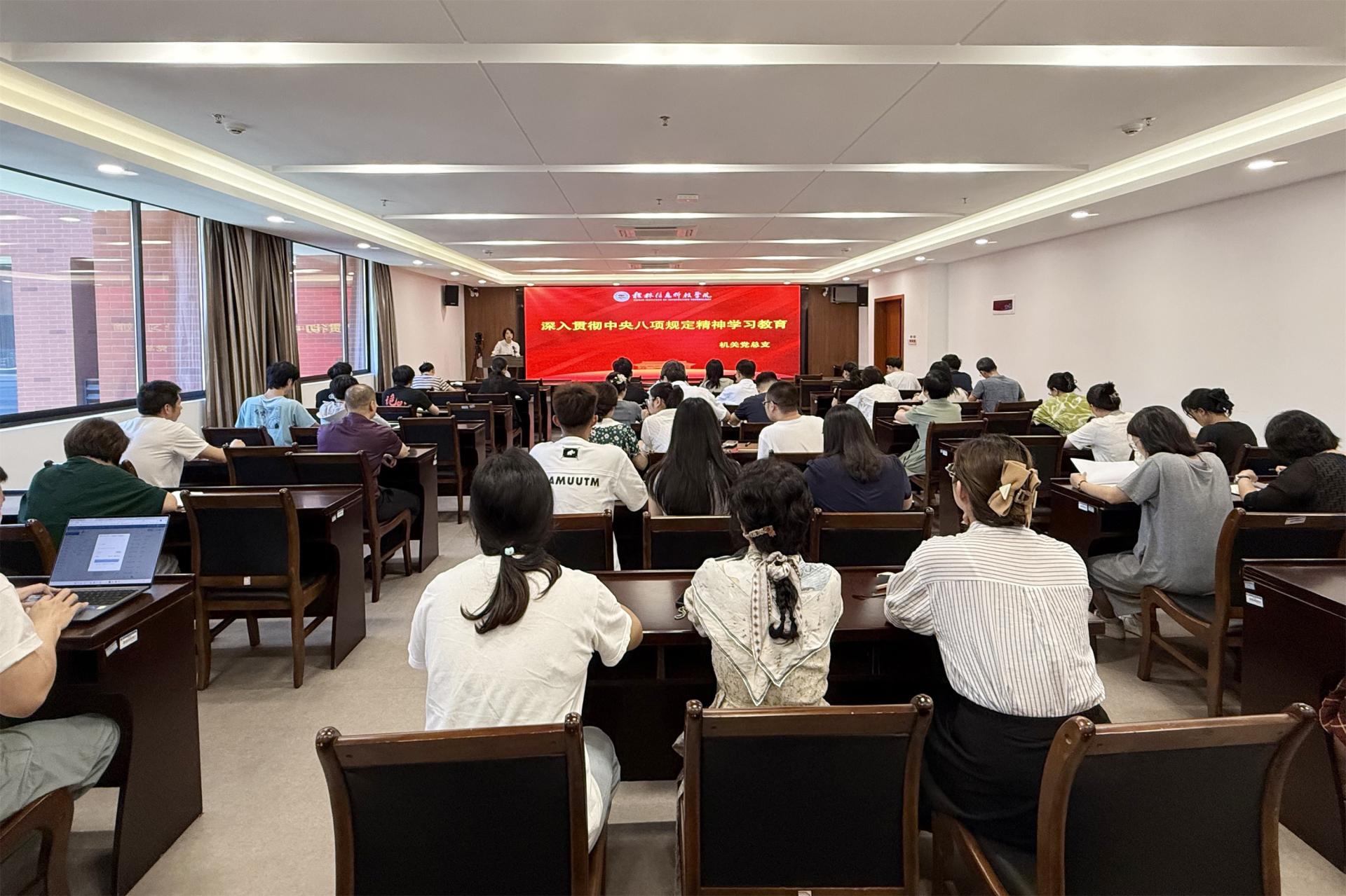 6月25日下午,beat365在线唯一官网机关党总支书记庄璧瑛在知行楼818会议室为全体党员上了一堂“深入贯彻中央八项规定精神学习教育”专题党课。