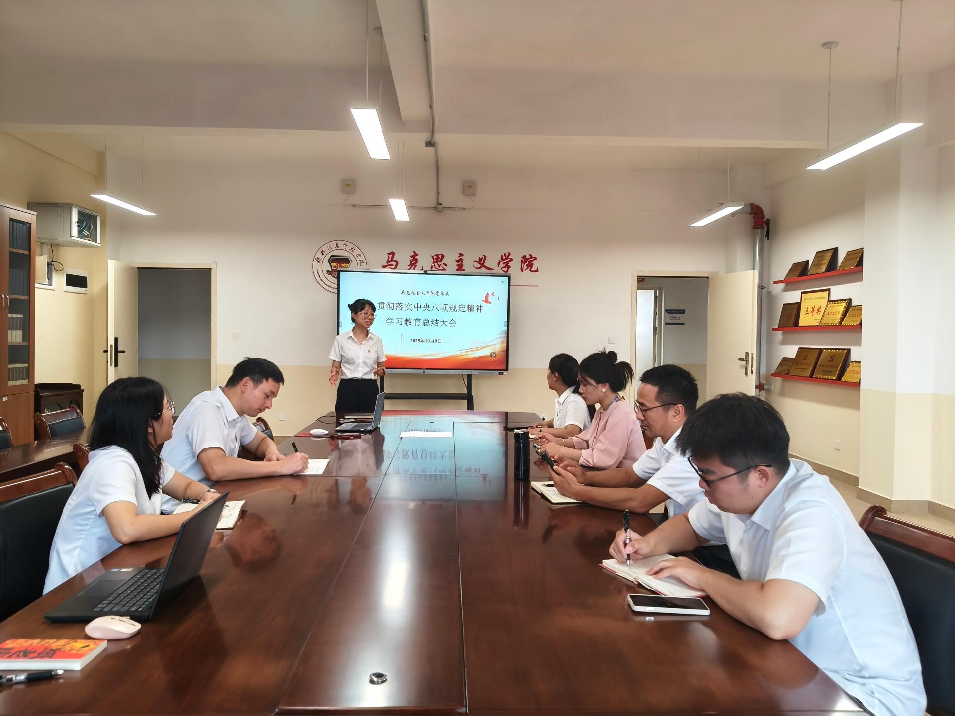 10月9日下午,马克思主义学院党总支在G610会议室召开深入贯彻中央八项规定精神学习教育总结会,会议由党总支书记赵奕主持,党总支委员、各支部书记及组织员参加会议。
