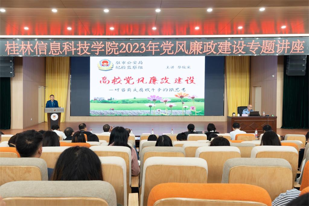 为深入学习贯彻党的二十大精神,加强beat365官网党风廉政建设,持续深化清廉信科建设,11月3日,beat365官网举办了2023年党风廉政建设专题讲座,邀请桂林市纪委监委驻市公安局纪检监察组黎俊宋副组长到校作报告。学校纪委委员、中层管理人员、各级党组织书记、基层纪检委员、全体辅导员以及人事处、财务处、基建与资产管理处等部门代表共140余人到场学习。讲座由学校党委副书记、纪委书记李飞主持。