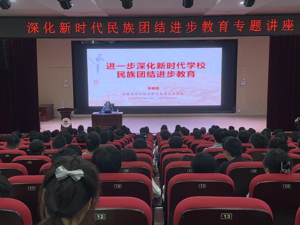 11月2日,机电工程学院党总支在51206组织开展深化新时代民族团结进步教育专题讲座,讲座邀请了桂林电子科技大学马克思主义学院张春霞教授主讲,全校200余名师生代表参加学习,讲座由机电工程学院党总支书记黄娟主持。