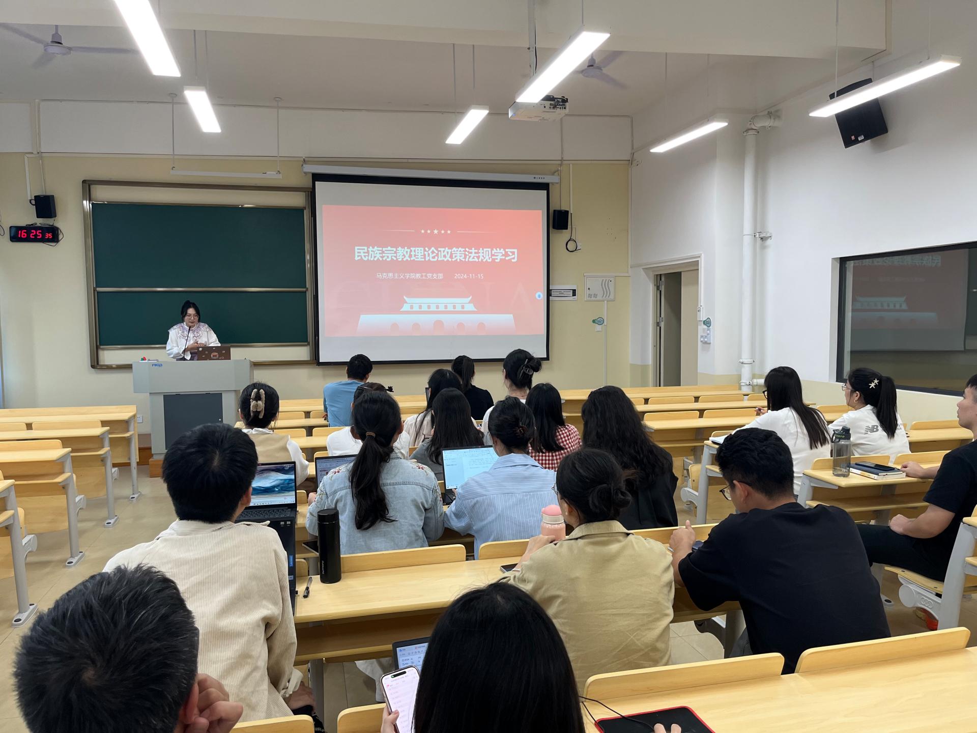 为进一步深化民族团结进步宣传教育,铸牢中华民族共同体意识,深入探讨和加强对民族宗教政策的理解与应用,11月15日,马克思主义学院教工党支部于C514教室召开民族宗教理论政策主题学习会。本次会议由党支部统战委员周莉老师主讲,全体党员参加。