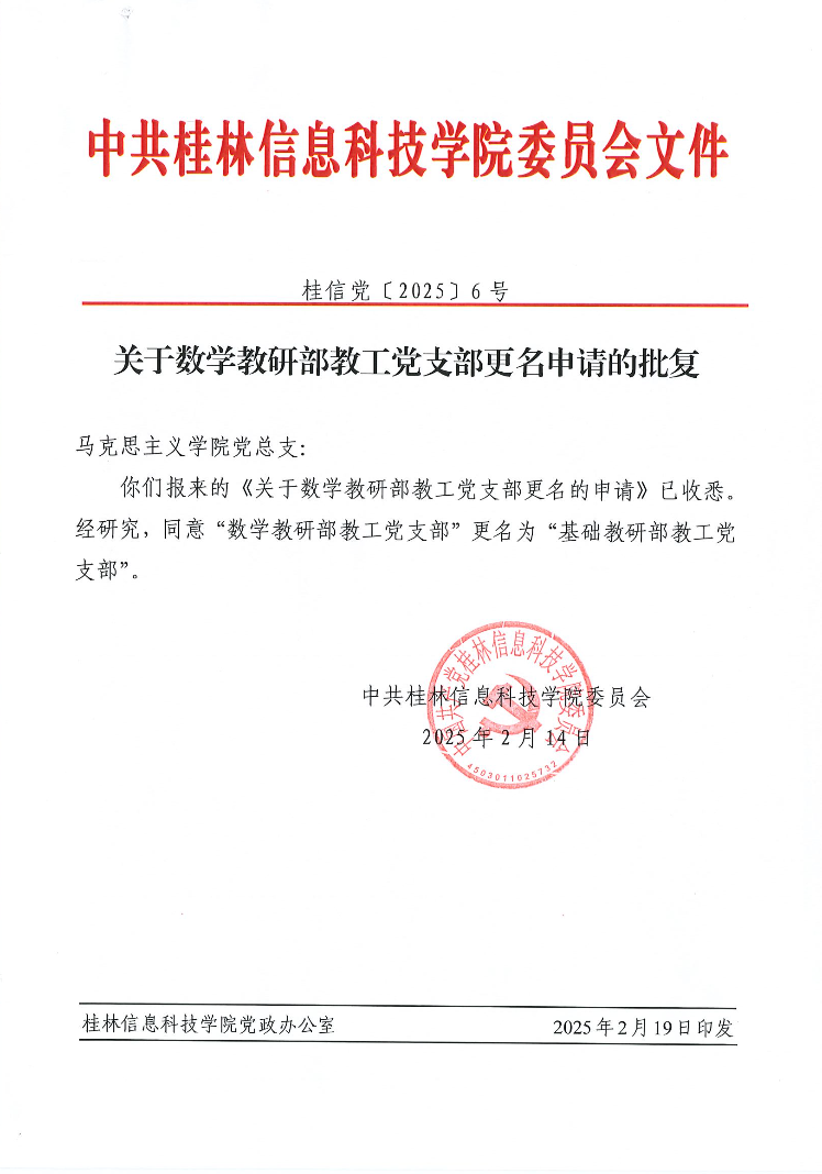 关于数学教研部教工党支部更名申请的批复