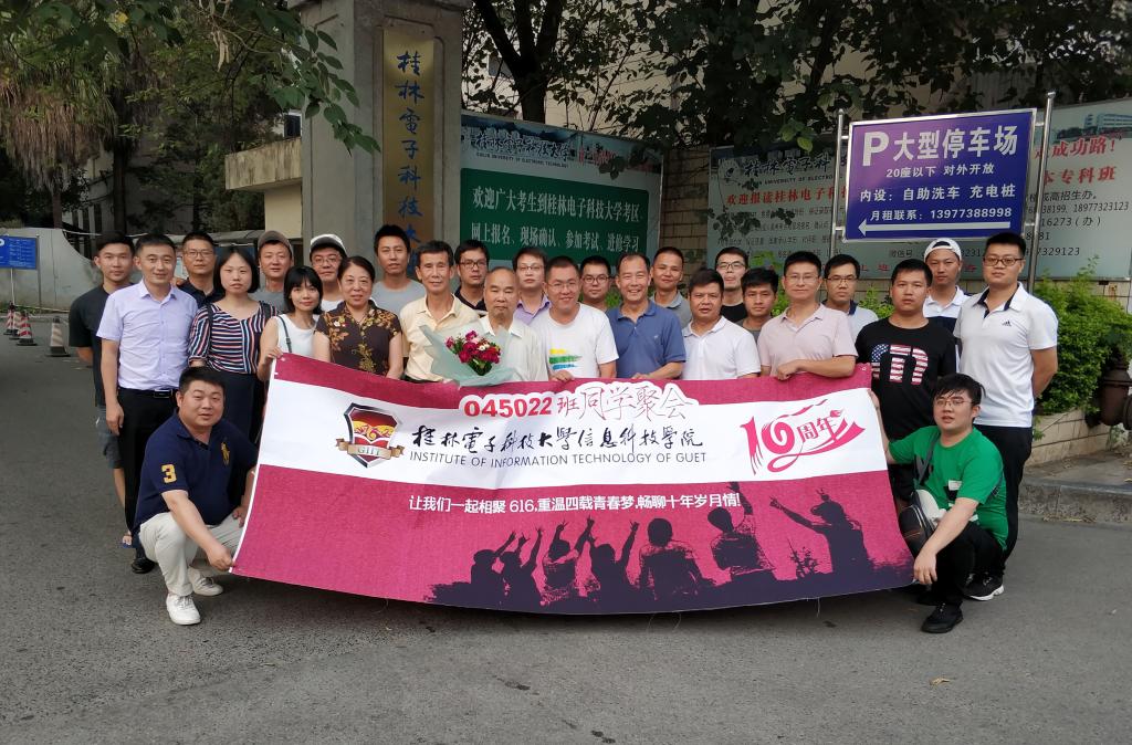 听了校友们的汇报后,雷校长发表了语重心长的讲话,他表示受邀参加同学们毕业10周年返校活动,看到同学们的成长以及学校今天的发展成就,感到非常高兴、激动和感动。他回顾了学校的办学历史,并结合党的八七会议等历史史实,向校友们介绍了学校当初如何定位,如何找到自己办学的立足点,以及办出特色的过程,并祝福校友和学校的发展越来越好。电子工程系李长俊主任向校友们介绍了该系的相关情况。最后,雷校长和师生们一起移步到桂林电子科技大学西校区门口合影并签名留念。