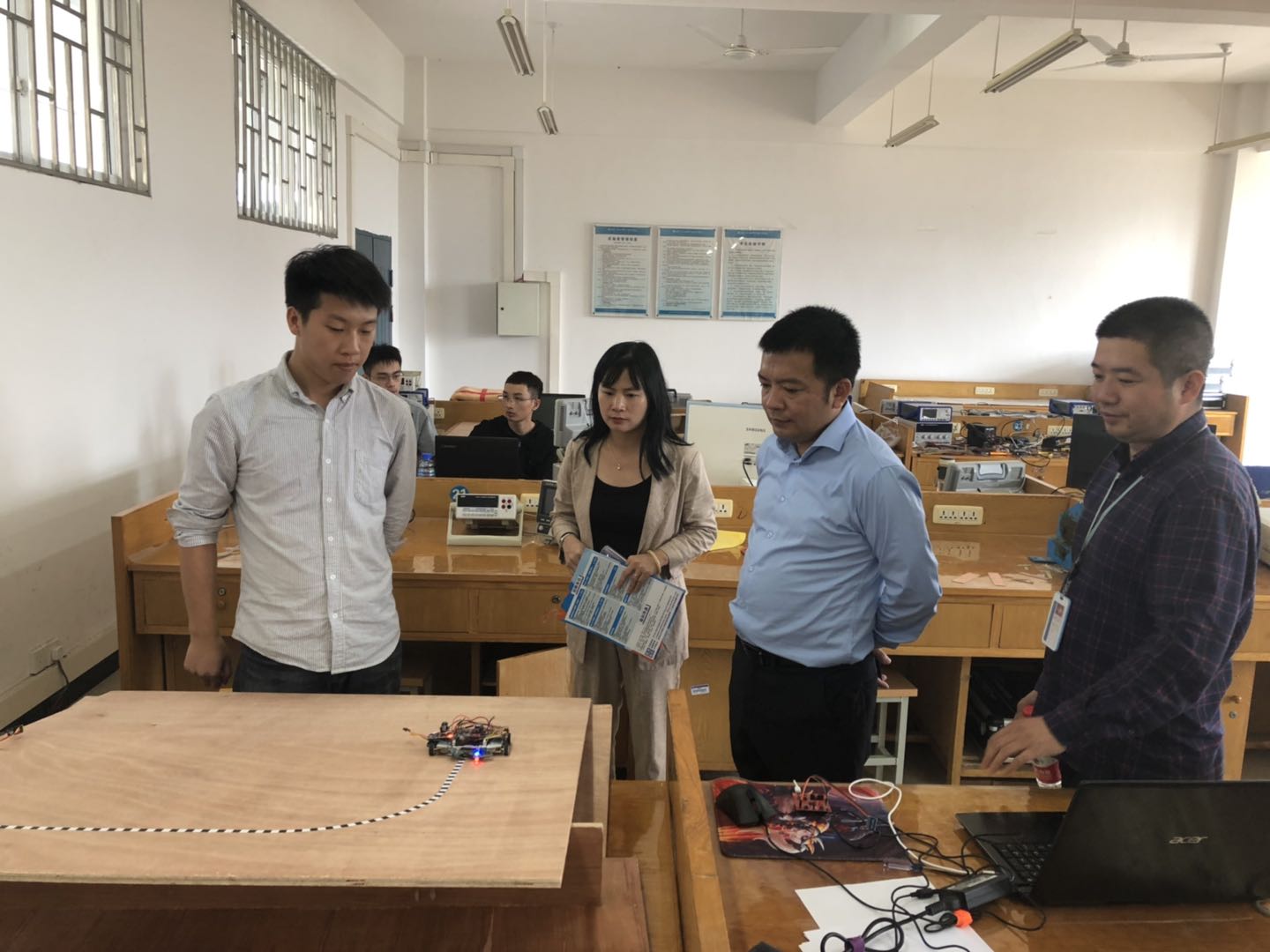 大赛最后一日,各队为本队作品进行最后各模块的完善、优化及调试。期间,周副院长一行对比赛场地及设施安全稳定、各队比赛进度等情况进行了解。并强调各队制作作品期间,务必保证安全,鼓励队员们冲刺时刻不懈怠,争创优秀成绩。