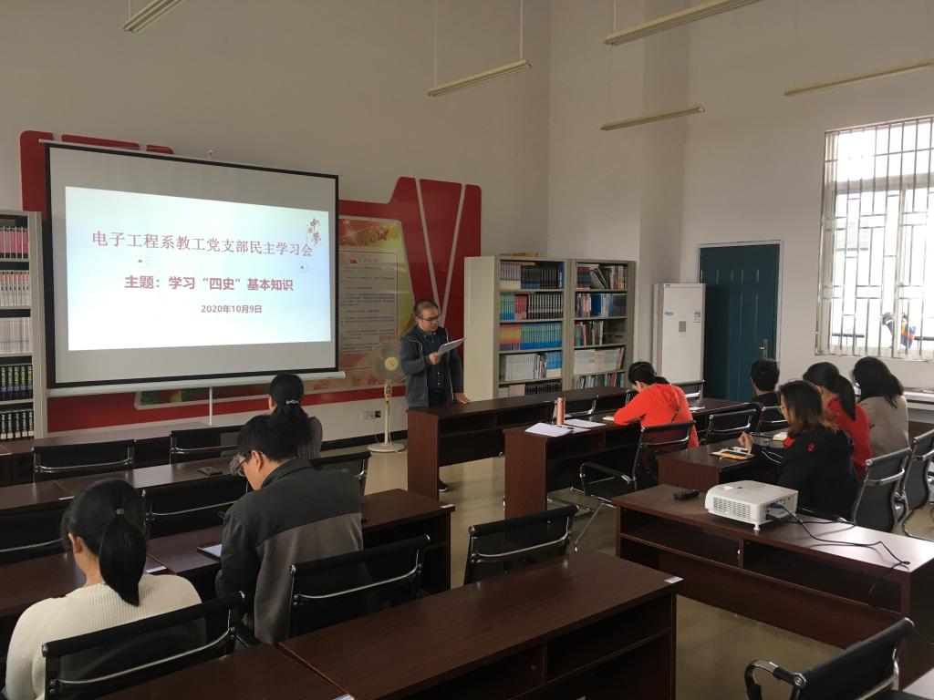 10月9日中午,电子工程系教工党支部在41502开展“四史”专题学习会,本次会议由教工党支部书记李登辉主持,学院副院长彭倩、支部全体党员参加会议。