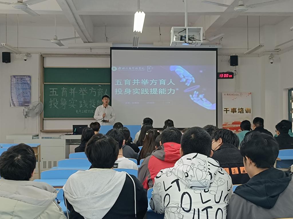 3月30日,电子工程学院在31106教室开展“五育并举,体育育人”主题干事培训,本次培训由学院2022级辅导员彭博涛主讲,共计60余名同学参加培训。