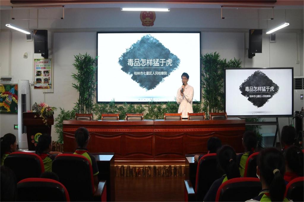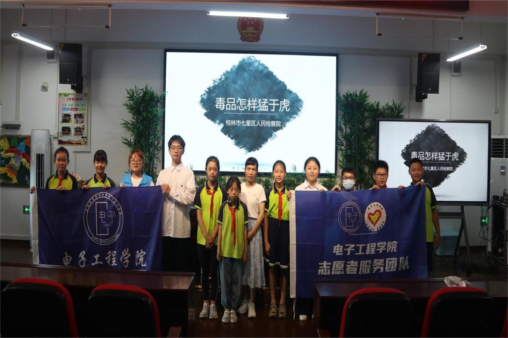 6月14日下午,电子工程学院“青年之声”法治宣讲团联合桂林市七星区人民检察院检察官前往桂林市英才小学开展禁毒宣传进校园巡讲活动。本次活动由学院分团委书记范恒祯、分团委副书记朱济亨带队,2名宣讲团成员参与宣讲。