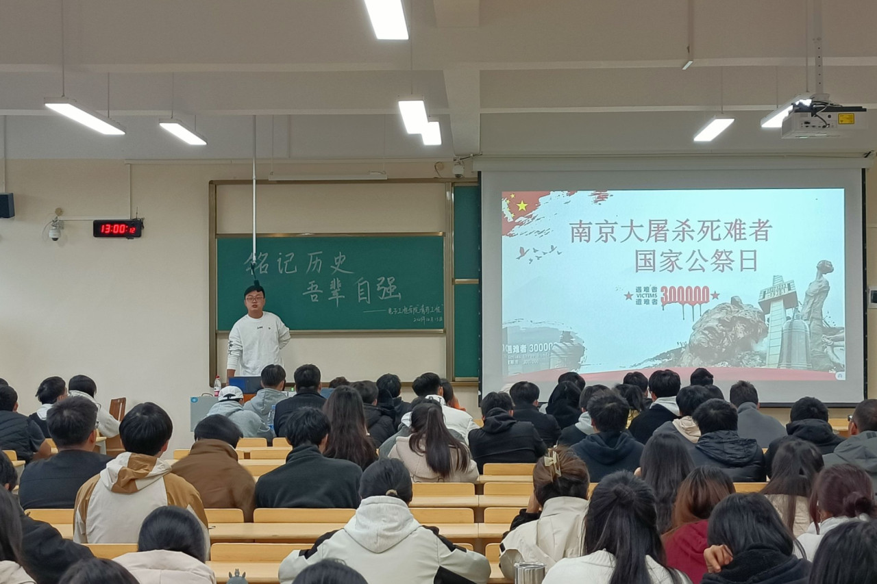 会前,朱济亨和全体与会同学进行集体默哀一分钟,沉痛悼念在南京大屠杀中遇难的同胞。会中,朱济亨通过播放《南京大屠杀》历史记录短片,帮助同学们进一步了解南京大屠杀的真实历史,并向同学们介绍了国家公祭日的由来,呼吁同学们铭记历史,勿忘国耻,继承和传承先辈的奋斗精神,更加珍视、守护当今的和平世界。最后,朱济亨带领全体与会同学进行庄严宣誓。