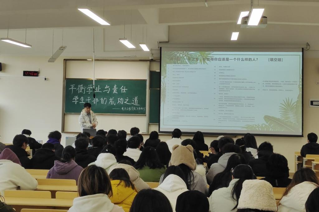 为帮助学生干事处理好学业和学生工作之间的关系,促进学生干事综合素养全面提升。12月21日,电子工程学院在D509教室开展学生干事专题培训会。本次会议由曾桐宇老师担任主讲,电子工程学院分团委学生会全体成员参加。