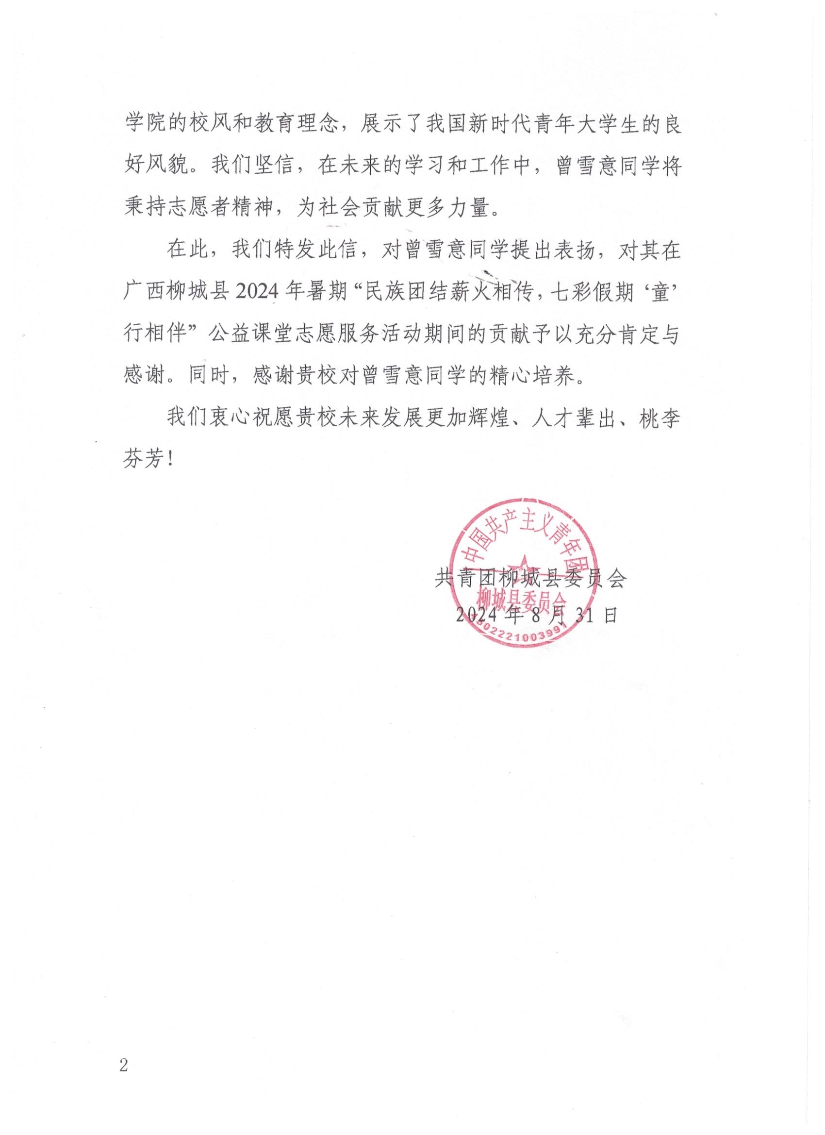近日,共青团柳城县委员会向电子工程学院发来表扬信,对学院2023级电子信息工程专业曾雪意同学在大学生“返家乡”社会实践活动中积极团结同事,高效开展志愿服务工作展示出的责任担当表示高度肯定和赞扬,同时也对beat365官网人才培养工作给予了赞赏。