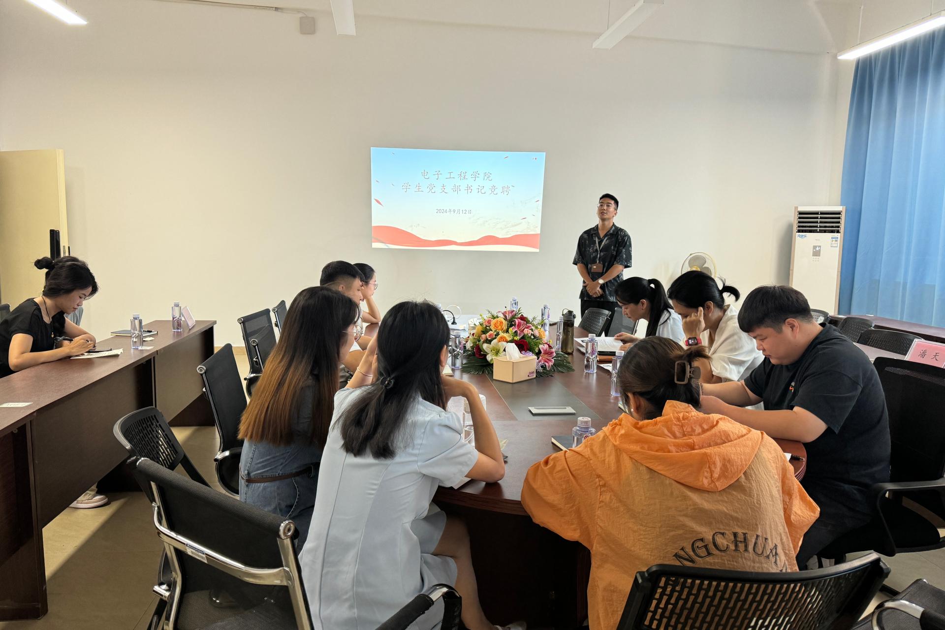 2024年9月12日,电子工程学院在敦明楼A513会议室召开学生党支部书记竞聘会,担任本次竞聘的评委有学院党委书记梁自珍老师、院长助理梁晓梅、学生工作办公室主任谢长远及各年级主任。学院6名专职辅导员参与本次竞聘。