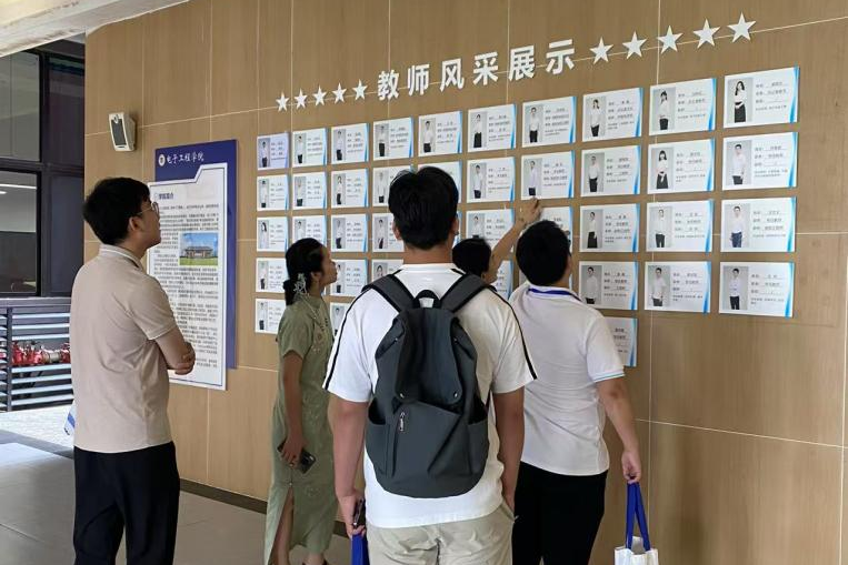 我院校友通过志愿者的引导,首先来到敦明楼一楼进行签到。早上10点半,校领导和师生齐聚明月湖边拍照合影留念。随后,校友代表在电子工程学院党委书记梁自珍和党委副书记池锴的带领下,前往知行楼818参与了校友座谈会。其余的校友跟随讲解员的脚步,参加了同游校园、校史重温等特色活动,分别参观了校机器人中心、图书馆和一站式服务中心。