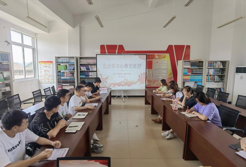 7月7日,电子工程学院第一学生党支部在41502党员活动室开展党史学习教育心得交流会,会议由党支部书记池锴主持,支部全体在校党员参加会议。