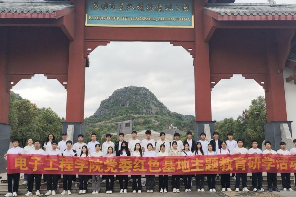 为扎实推进党建带团建制度机制落实落地、见行见效,大力弘扬爱国主义精神,传承红色基因。11月5日,电子工程学院党委组织电子工程学院第四学生党支部学生党员、电子工程学院分团委和学生会学生代表前往美国飞虎队桂林遗址公园开展红色研学活动。电子工程学院第四学生党支部书记彭博涛老师带队参加。