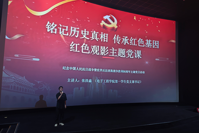 为纪念中国人民抗日战争暨世界反法西斯战争胜利80周年,9月28日,电子工程学院党委组织开展“铭记历史真相・传承红色基因”主题党课,学院各支部党员参与学习,由第一学生党支部书记张泽鑫主讲。