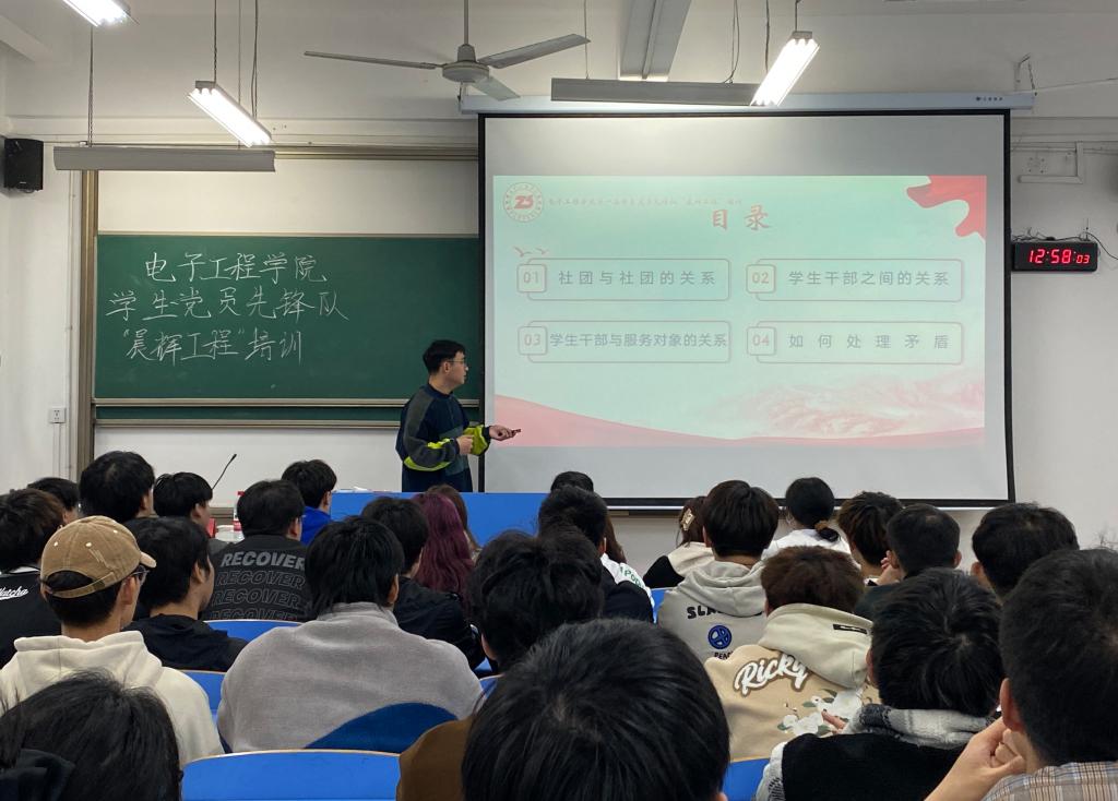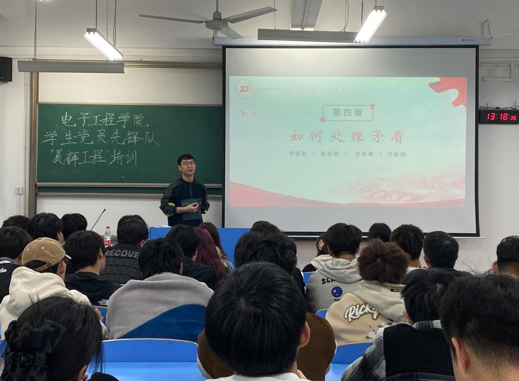 3月5日中午,电子工程学院学生党员先锋队在31102教室召开晨辉工程系列活动之“大学生人际交往”专题培训会。培训会由辅导员彭博涛主讲,学生党员先锋队全体队员参加会议。