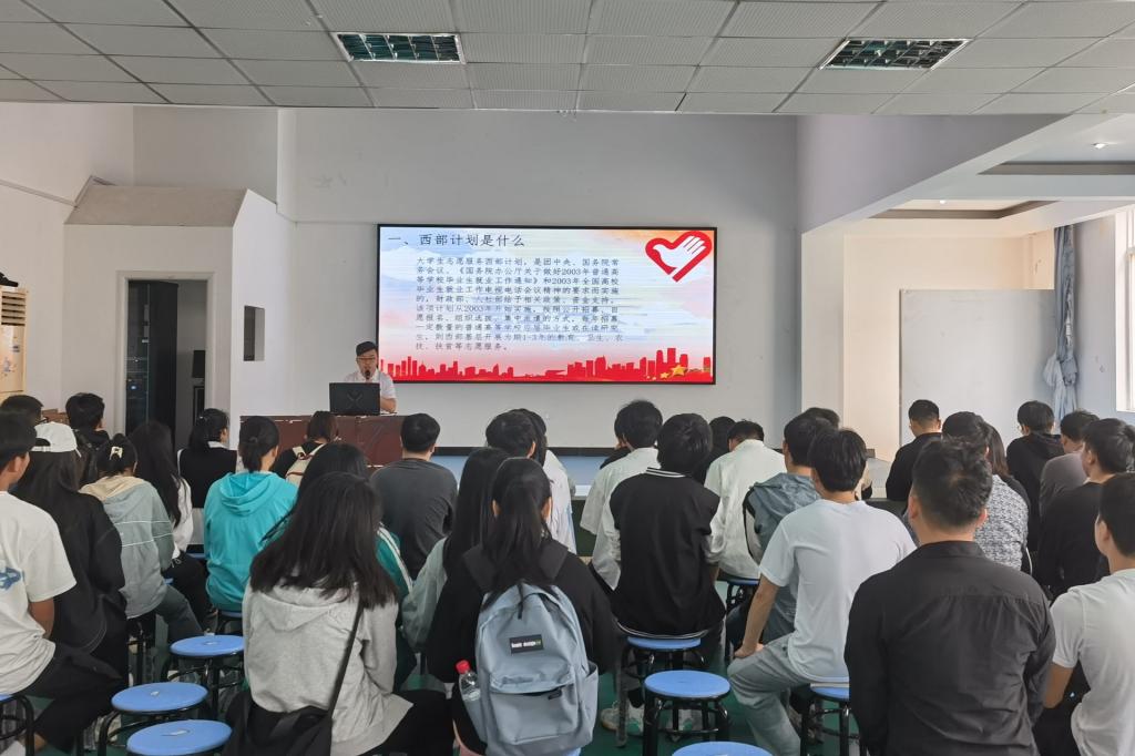 会上,朱老师从西部计划的服务期限、招募要求以及招录程序等方面为在场的同学们进行了整体的介绍和细致的解读,并重点强调了今年西部计划网上报名的相关要求与注意事项。同时,鼓励现场学生积极响应国家号召,扎根西部基层从事志愿服务工作,为西部发展和国家建设作贡献。
