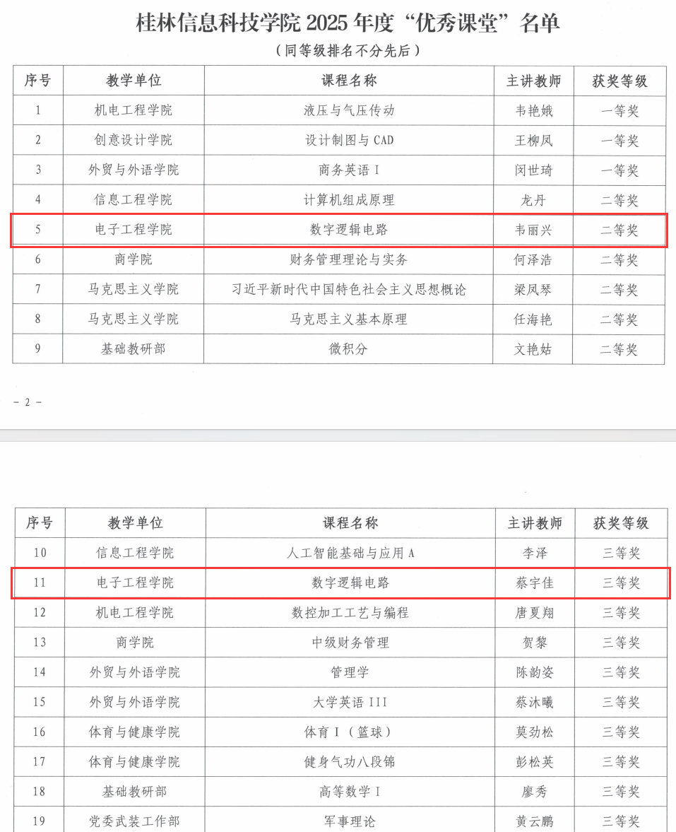 在此次评选中,韦丽兴老师讲授的《数字逻辑电路》课程,教学大纲与教案设计严谨,对教学环节进行清晰完整的规划,在课堂中注重理论知识与实践应用的结合,讲解过程深入浅出,并擅长通过提问、讨论等方式营造积极活跃的互动氛围,有效激发了学生的学习兴趣与思维参与,凭借出色的教学表现荣获二等奖。蔡宇佳老师讲授的《数字逻辑电路》课程,教学大纲与教案逻辑严密、环节详实,在教学内容组织上注重基础与前沿并重,通过巧妙设计课堂活动和教学步骤,使知识传授层层递进、重点突出。其课程在保持内容深度的同时兼顾教学节奏的把握,充分展现了优秀的教学设计能力与课堂驾驭水平,荣获三等奖。