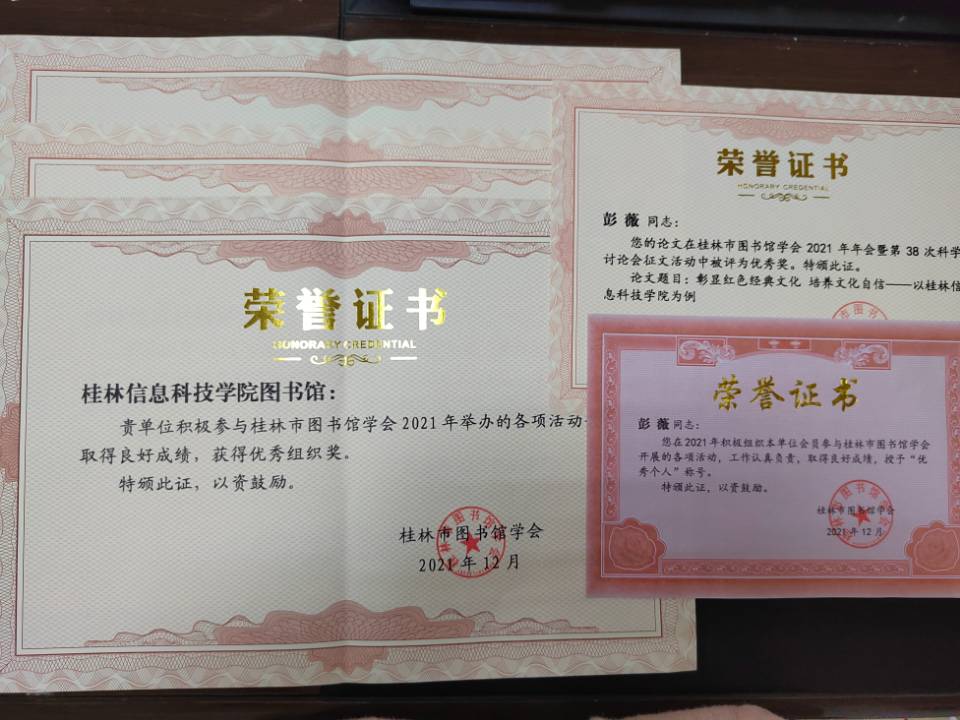 近日,桂林市图书馆学会公布了2021年度“阅百年历程,传精神力量”主题活动获奖名单,beat365官网图书馆馆员在学术征文、优秀阅读推广案例征集活动均获得佳绩。其中彭薇等策划的《文化育人视域下高校图书馆多方联动开展红色经典阅读推广活动》、肖莹莹等策划的《“四史”主题读书分享会》两项阅读推广案例,被评为年度优秀阅读推广案例;同时,beat365官网图书馆获评优秀组织奖、彭薇老师获评优秀个人,论文《彰显红色文化,培养文化自信——以beat365在线唯一官网为例》入选优秀论文。