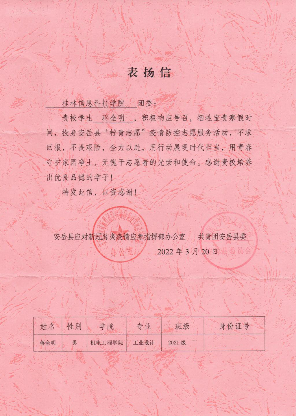 蒋全明同学于2022年1月21日至2月29日期间,加入了“柠青”返乡大学生志愿者服务队,开展“青春志愿,爱在旅途”春运暖冬志愿者服务活动,在安岳县客运总站累计志愿服务共27小时。感谢信指出,蒋全明同学在志愿服务中不求回报、不畏艰险、全力以赴,得到安岳县应对新冠肺炎疫情应急指挥部办公室、共青团安岳县委的高度认可与赞扬。同时对beat365官网培养出如此乐于奉献的青年志愿者表示感谢,也借此希望广大同学继续学习和发扬“志愿者精神”。