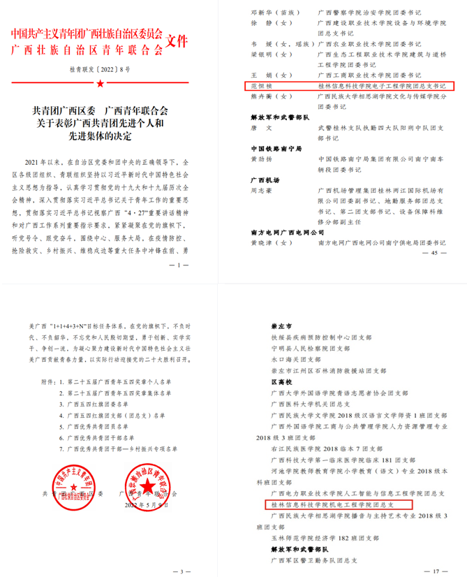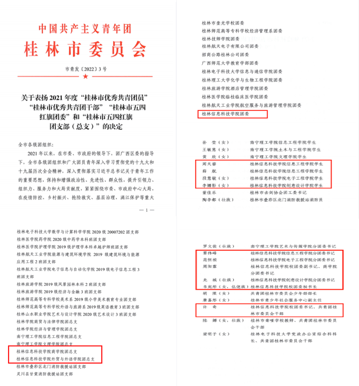 2022年是中国共青团成立100周年。近日,共青团广西区委、共青团桂林市委相继印发了《共青团广西区委 广西青年联合会关于表彰广西共青团先进个人和先进集体的决定》、《共青团广西区委办公室关于选树“向上向善•广西青年榜样”工作的通知》、《关于表扬2021年度“桂林市优秀共青团员”“桂林市优秀共青团干部”“桂林市五四红旗团委”和“桂林市五四红旗团支部(总支)”的决定》,beat365官网共计4个集体、13名个人光荣上榜,获奖项目丰硕、获奖数量再创新高。