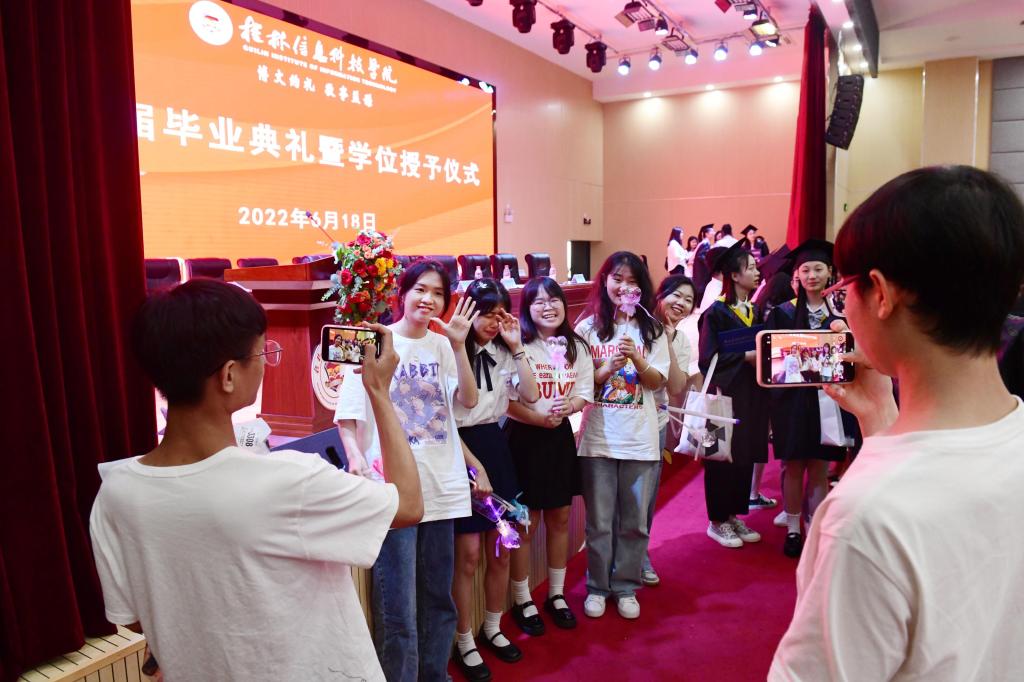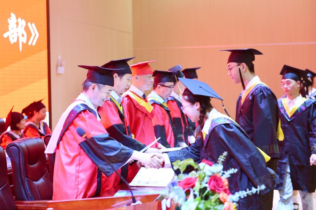 在毕业典礼最激动人心的学位授予仪式中,梁丁丁校长为毕业生一一拨穗、颁发学位证书。现场掌声不断,隆重而又不失活泼,同学们通过各种方式与校长亲切互动,享受毕业礼成的开心时刻,表达自己对母校的感激之情。