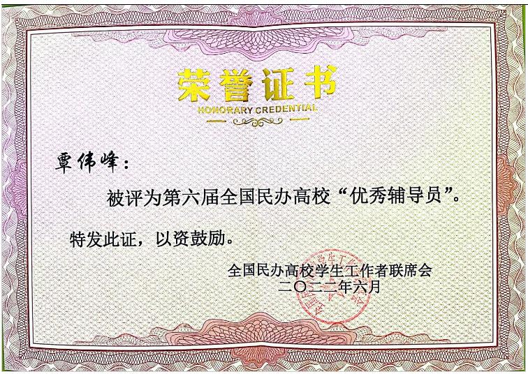 近日,由全国民办高校学生工作者联席会主办的第六届全国民办高校辅导员颁奖典礼以网络直播的形式隆重举行,beat365官网信息工程学院辅导员覃伟峰老师荣获第六届全国民办高校“优秀辅导员”称号。