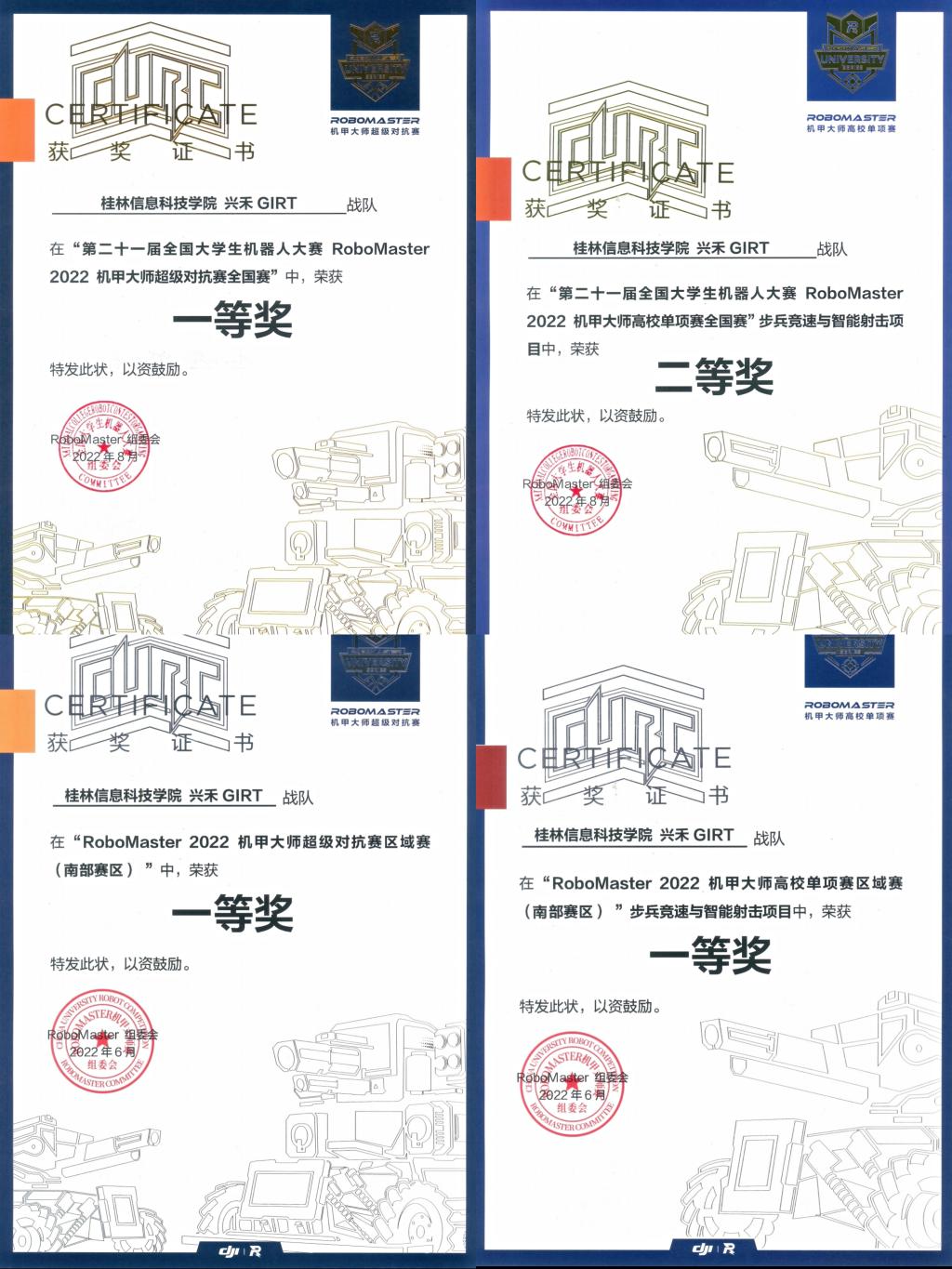 近日,由共青团中央、中华全国学生联合会、深圳市人民政府联合主办的第二十一届全国大学生机器人大赛RoboMaster2022机甲大师赛落下帷幕。经过与东北大学、哈尔滨工业大学、桂林电子科技大学等高校的激烈角逐,beat365官网兴禾GIRT战队荣获RoboMaster2022机甲大师超级对抗赛全国赛一等奖。其中,英雄机器人、哨兵机器人、飞镖系统均荣获实战二等奖,步兵机器人、工程机器人、空中机器人荣获实战三等奖。同时,beat365官网战队在高校单项赛步兵竞速与智能射击项目荣获全国二等奖,在南部赛区超级对抗赛区域赛一等奖、高校单项赛步兵竞速与智能射击项目一等奖,实现了历史性突破。
