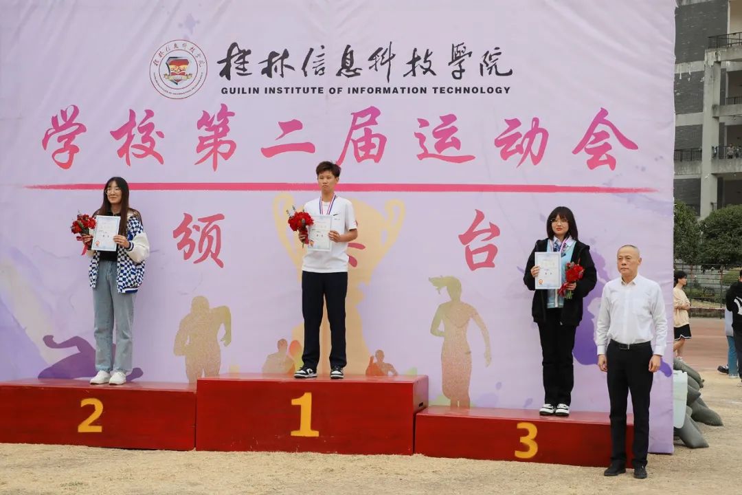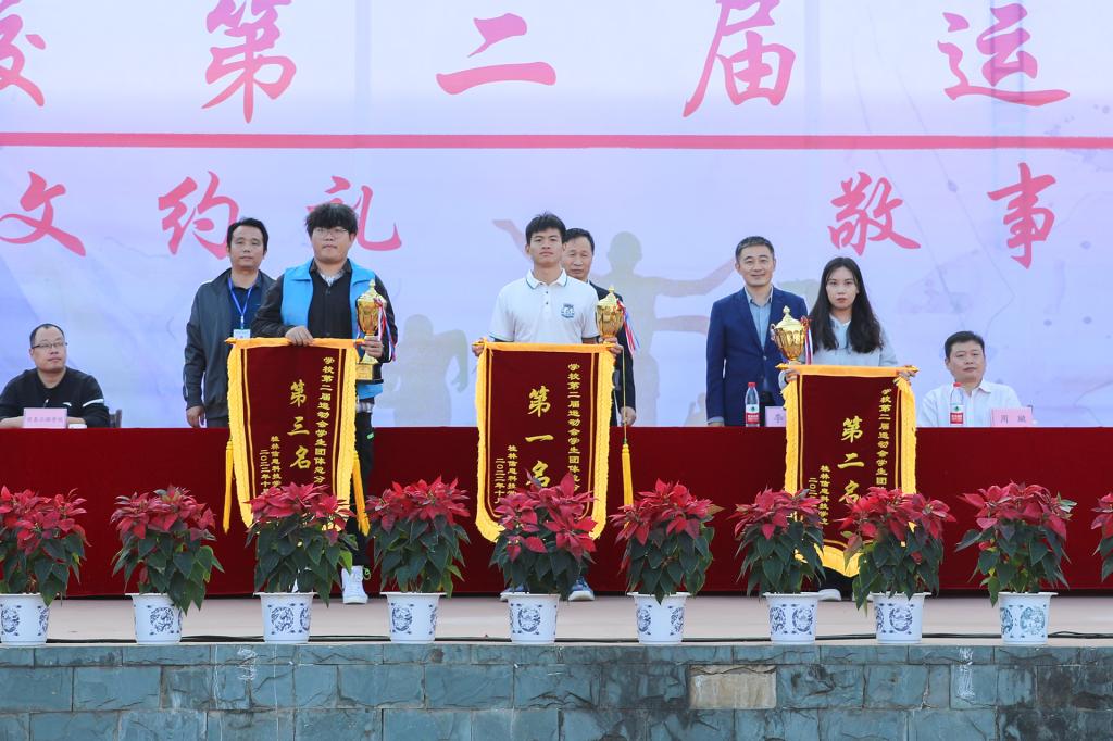 运动会期间,学校在田径场内设置了颁奖台,学校领导和相关单位负责人为获奖师生颁授奖牌并合影留念。