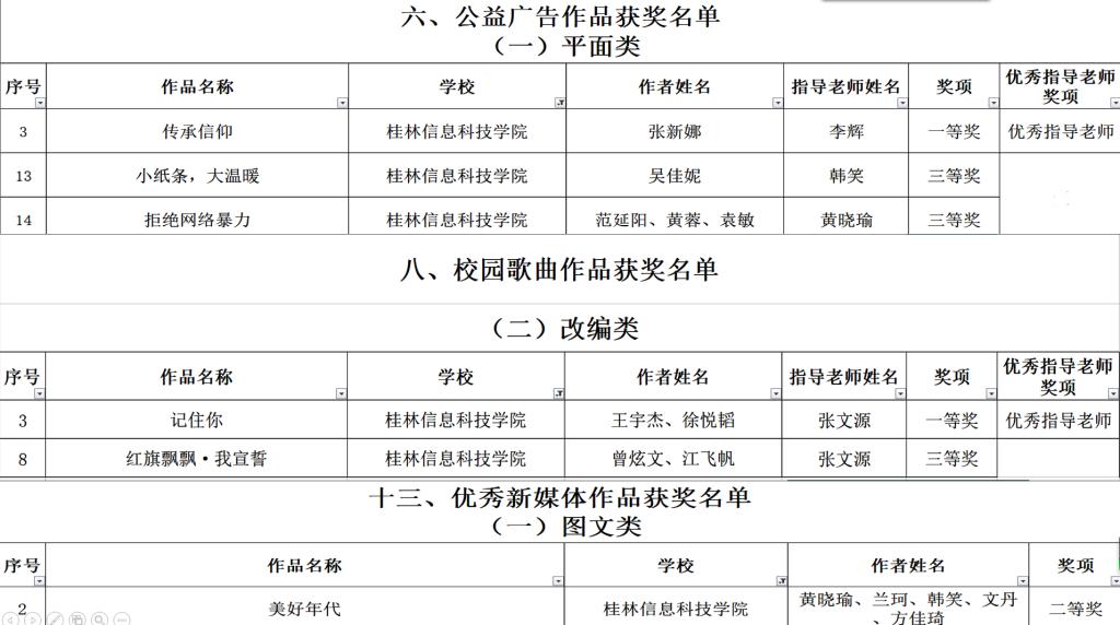 近日,由自治区教育厅和自治区党委网信办主办的第八届全区大学生网络文化节及2022年全区高校网络教育优秀作品推选展示活动获奖名单揭晓,beat365官网师生在微电影、公益广告、优秀新媒体、摄影、动漫和校园歌曲6类作品中获奖13项,其中一等奖2项,二等奖4项,三等奖7项,优秀指导教师2名。张文源、李辉2位老师获优秀指导老师。