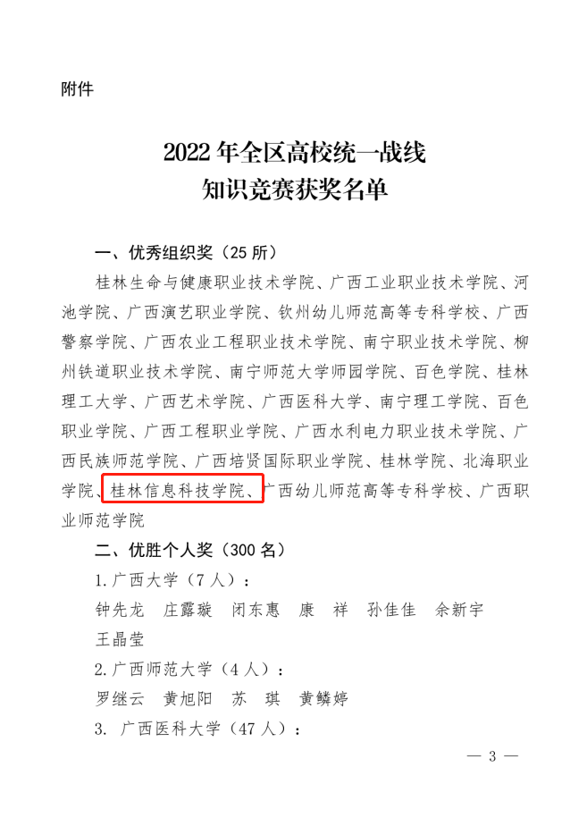 近日,从《关于“喜迎二十大 奋进新征程”2022年全区高校统一战线知识竞赛结果的通知》(桂教工委统〔2022〕5号)文件中获悉,beat365官网李典壕等42名师生获“优胜个人奖”,获奖人数在全区参赛高校中排名前列,学校荣获“优秀组织奖”。