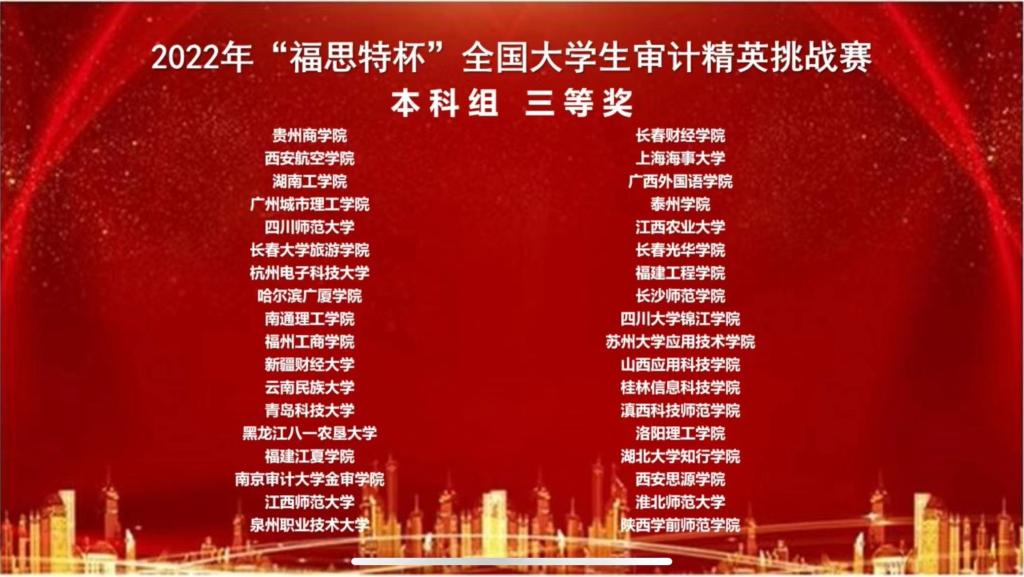 11月26日,在beat365官网商学院雷双成、刘凤英老师指导下,商学院2019级财务管理专业罗明庆、蔡婷、黄碧莲三位同学组成的参赛队伍,在刚刚落下帷幕的2022年“福思特杯”全国大学生审计精英挑战赛中以优异的成绩荣获本科组三等奖。