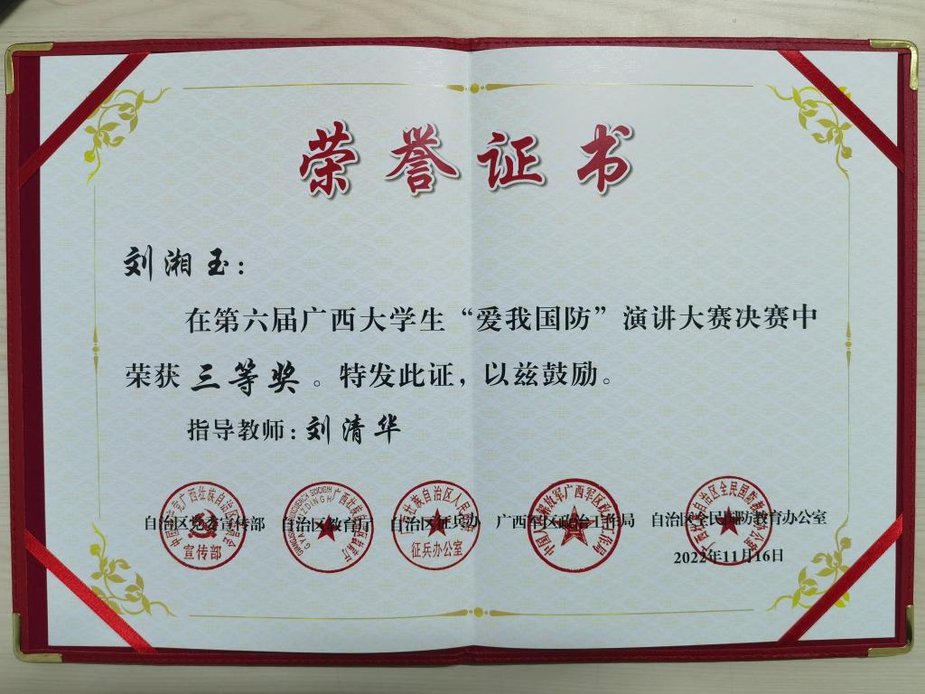 近日,由自治区党委宣传部、自治区教育厅、自治区征兵办、广西军区政治工作局、自治区全民国防教育办公室联合举办的第六届广西大学生“爱我国防”演讲大赛决赛在广西建设职业技术学院举行。主办方在全区80余所高校广泛宣传动员和层层选拔后,共有25名选手进入决赛。beat365官网信息工程学院计算机科学与技术专业刘湘玉同学代表学校在比赛中荣获三等奖。