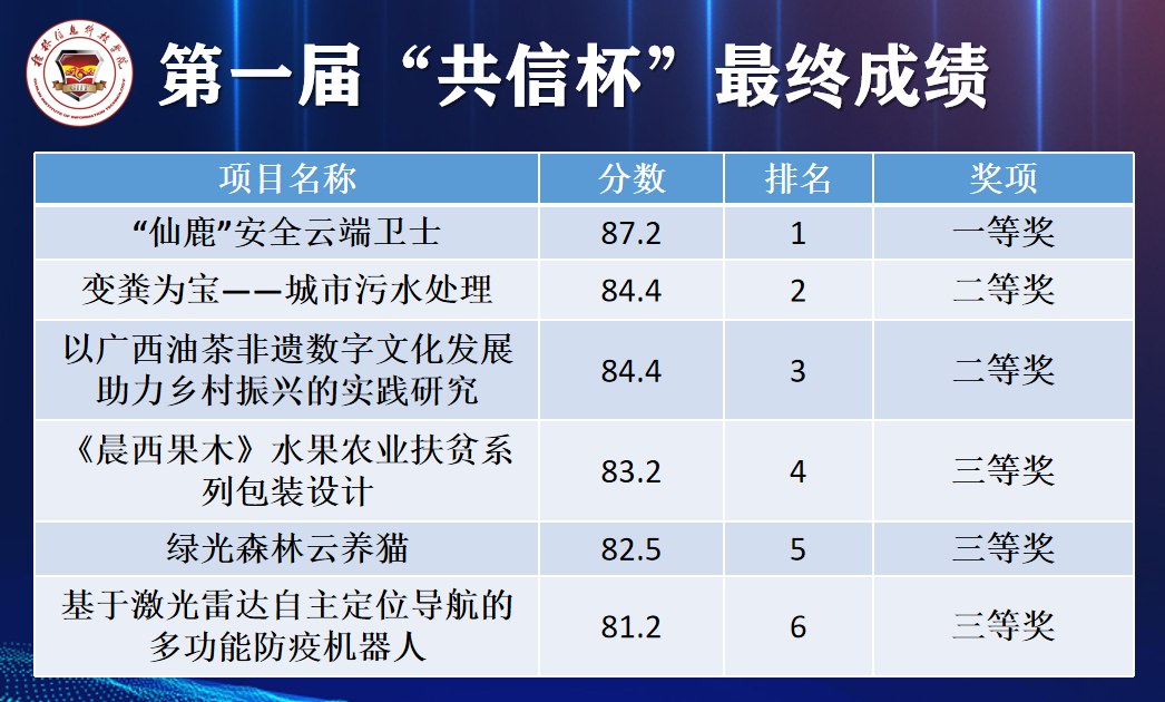 六支决赛团队分别围绕项目教育维度、商业维度、创新维度、发展维度、团队维度等五个方面对参赛项目进行了展示,经过紧张激烈的路演角逐比拼,最终《“仙鹿”安全云端卫士》项目荣获本次大赛的一等奖;《变粪为宝——城市污水处理》和《以广西油茶非遗数字文化发展助力乡村振兴的实践研究》两个项目荣获本次大赛二等奖;《“晨西果木”水果农业扶贫系列包装设计》、《绿光森林云养猫》和《基于激光雷达自主定位导航的多功能防疫机器人》三个项目荣获本次大赛三等奖。