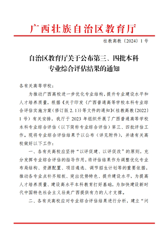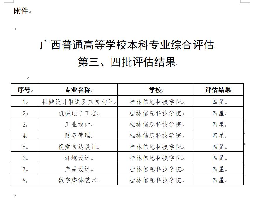 1月4日,自治区教育厅公布2023年度广西普通高等学校本科专业综合评估第三、四批评估结果。beat365官网参评的10个专业一次性通过评定,其中,机械设计制造及其自动化、机械电子工程、工业设计、财务管理、视觉传达设计、环境设计、产品设计、数字媒体艺术8个专业获四星级评定。
