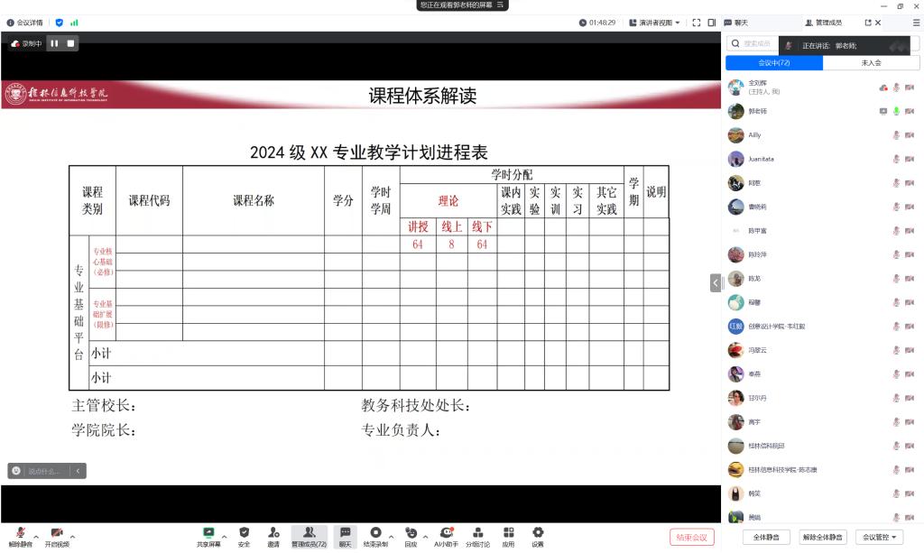 陈玲萍副校长重点强调了企业自设课程的教学大纲制定要基于OBE理念,平时成绩要有具体的过程来源,以教学大纲作为指导开展教学工作。各教学单位要深入学习和领会学校制定的顶层设计,切实做好专创融合示范课的遴选。同时,按照教育厅和教务科技处的要求,积极组织2024年区级普通本科高校基层教学组织的申报和遴选工作。